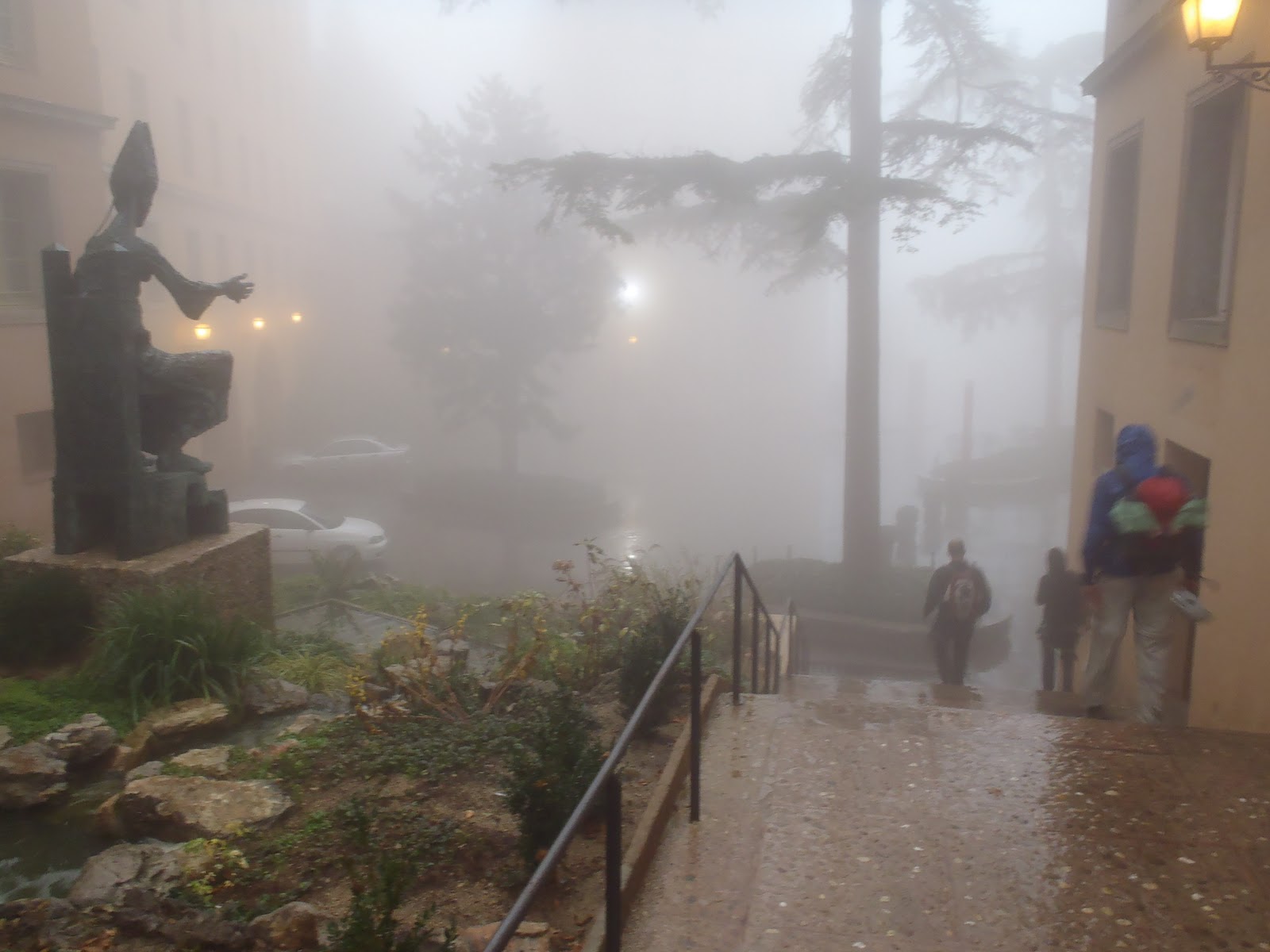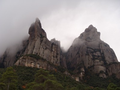 Sadepäivä tai ainakin osittain. Oli jo etukäteen tiedossa kostean kelin mahdollisuus, mutta lähdettiin kuitenkin Montserrattiin. Jo parin päivän on ollut pilveä ja näkyvyys välillä heikko, mutta ei se kiipeilyä ole haitannut. Oikeastaan vaan nopeuttanut toimintaa kun ei tarvitse ihmetellä luonnon kauneutta. Keli oli ihan ok perille päästessä, vaikka matkalla välillä ripotteli.