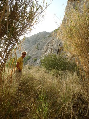 No, koska olimme kerrankin aikaisessa haettiin uutta reittiä ja löydettiinkin tapa kiivetä ylängölle. Reitti on Cami de l’Alsina. Pari kutosta ja sitten enemmän tai vähemmän helppoa seikkailukiipeilyä. Vaihdettiin kamat, minä pääsin ensimmäisen kp:n, hilattiin vielä toinen reppukin ylös, Ville oli kiivennyt noin 5 metriä, saanut 2 jatkoa irti ja sitten alkoi satamaan. Tällä kertaa sade oli yhtenäisempää ja Montserratin kivi ei kastumisen jälkeen ole kovin kitkaista vaan enemmänkin todella liukasta. Pakitettiin pois luostarin hunajakiskan kautta.