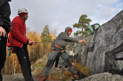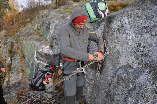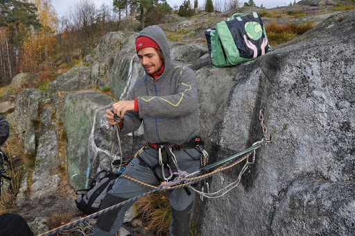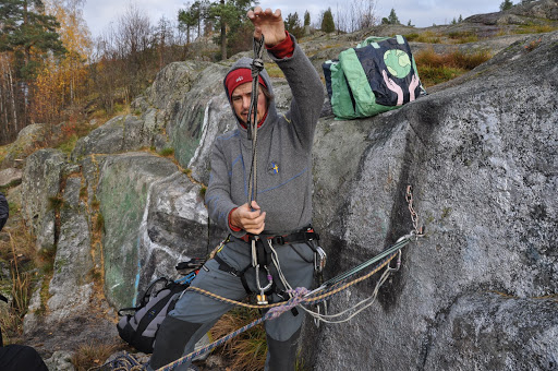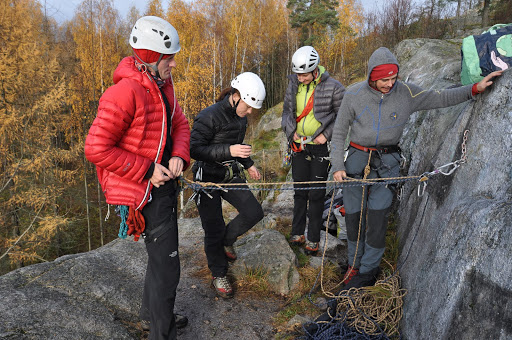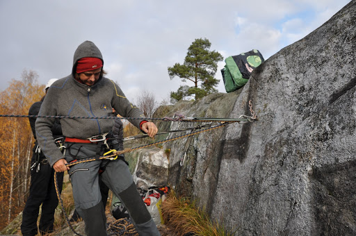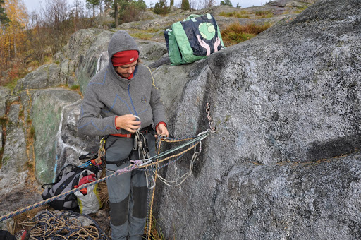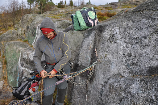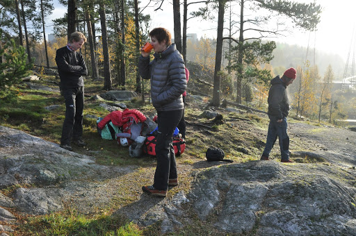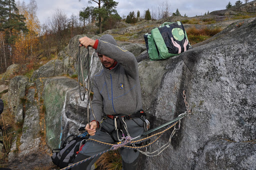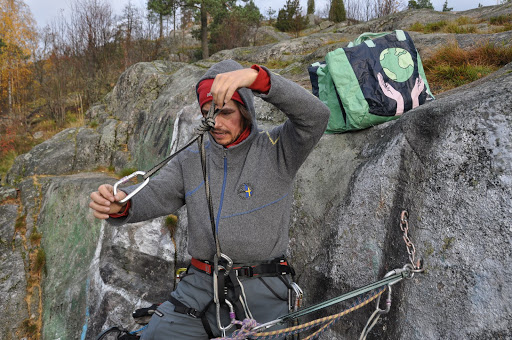 Sumuisena lokakuun lopun viikonloppuna Kiipeilysohlojen trädikiipeilyaktiivit, Nina, Pirjo, Mikko ja minä, kokoontuivat Käärmekalliolle Sohlojen hovivuoristo-opas Petter Reutterin johdolla perehtymään siihen mitä tehdään, jos Prestenin yhdeksännellä kp:llä tai jossain muualla korkealla kalliolla sattuu jotain ikävää.