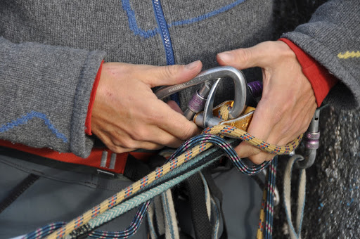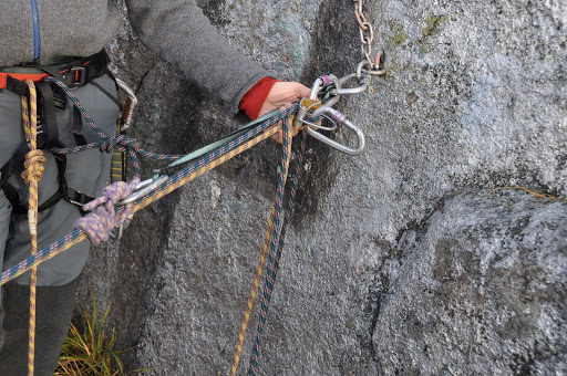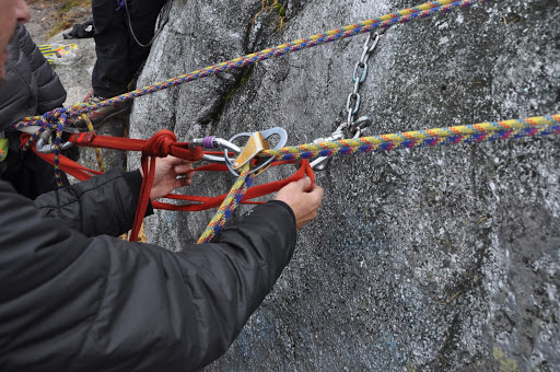 Pitää aloittaa tietysti pelastustoimet. Ensin prusik loukkaantuneen kiipeilijän kireällä olevien köysien ympärille ja slingillä ja sulkkareilla kiinni ankkuriin.