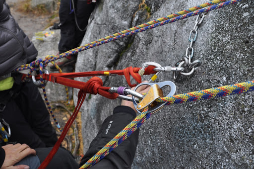 Ja mitäs sitten? No kiinnitetään pidempi suuri lenkki sulkkarilla belay looppiin, laitetaan toinen sulkkari pienempään suureen lenkkiin, tämä sulkkari on siis loukkaantuneen kiinnittämistä varten. Seuraavaksi köydet varmistusvälineen läpi ja varmistusväline sulkkarilla kiinni slingin pienimpään lenkkiin, kuten normaalistikin tehtäisiin laskeutumaan lähdettäessä. Lopuksi vielä prusik köysien ympäri ja kiinni valjaiden jalkalenkkiin.