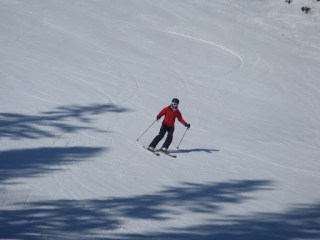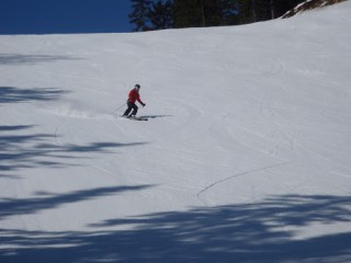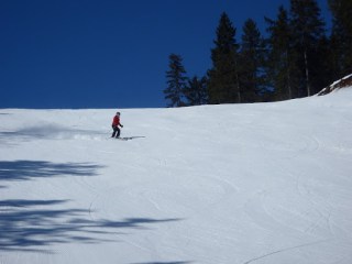 Sää ja keli enemmän kuin suosi. Aurinko paistoi ja rinteet eivät olisi voineet olla paremmassa kunnossa. Kovahkojen yöpakkasten jäljiltä rinteiden pohjat pysyivät koko päivän kovana, muutamasta plusasteesta huolimatta. Rinteiden pinnalla oli kuitenkin pääosin mukava pehmeä kerros. Joten sen kun ”heitti” sukset rinteeseen ja antoi mennä täysillä ”suksien mukana”. Sama keli jatkui läpi koko viikonlopun. Harvoin pääsee neljää päivää laskemaan näin täydellisissä oloissa! Muiden laskijoiden vähäinen määrä vielä kruunasi täydelliset olosuhteet. Seuraavassa kuvasarjassa Lotta demonstroi sujuvasti hyviä laskuolosuhteita Musta Pekka -rinteessä, joka nimensä mukaisesti on jyrkkä musta rinne.
