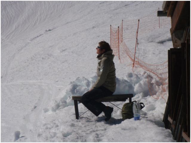 | Ansaittu lepo alppimajalla kohtalaisen hikisen nousun jälkeen. |