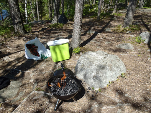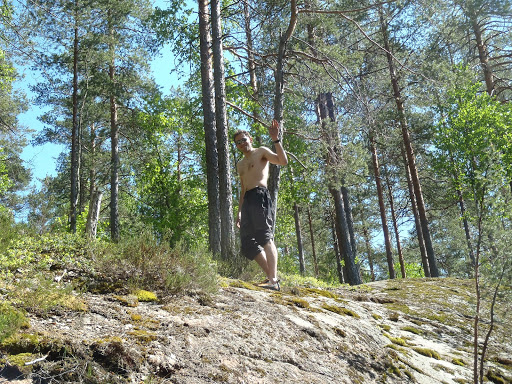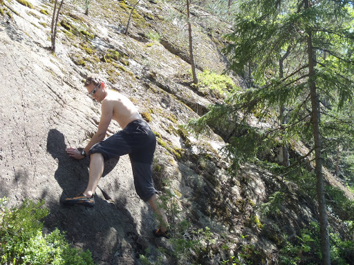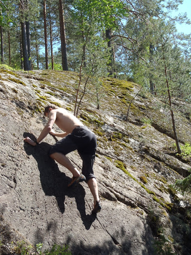 Kaitalammen reunojen sileät mukavan pyöreät kallioseinät suorastaan vaativat pientä släbitekniikan treenailuboulderointia leppoisan grillailun lomassa. Kalliot ovat pääosin melko sammaleisia, mutta puhtaitakin kohtia löytyy pienellä haeskelulla. Ko. alueella ei kuitenkaan varmasti ole kovin suotavaa ryhtyä kallioita puhdistelemaan, mutta pienikin pläntti riittää släbitekniikan mieleen palautteluun. Ja kun ei kovin pitkiä pätkiä lähde vetämään niin ei edes pelota. Kalliot ovat mukavan loivia, mutta silti pääsee ihan sopivasti testailemaan jalkatekniikkaa. Oheisessa kuvasarjassa allekirjoittanut näyttää hieman mallia…ja kun on saanut tarpeeksi kiipeilystä niin voi siirtyä grillailun pariin…