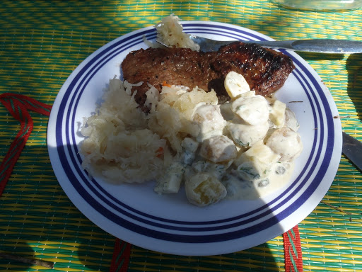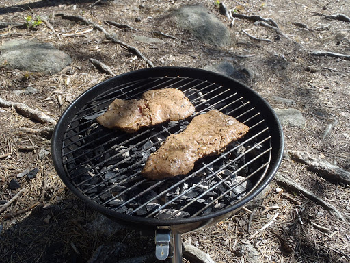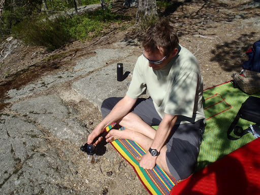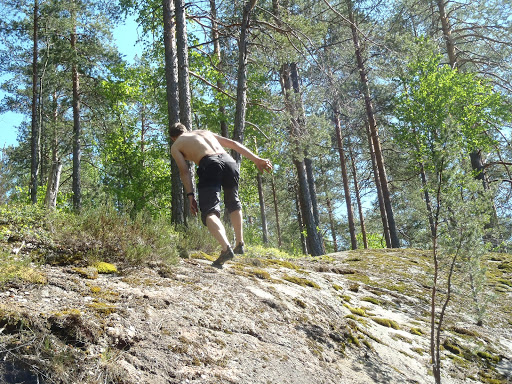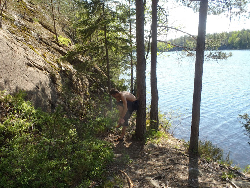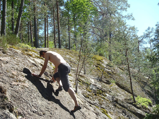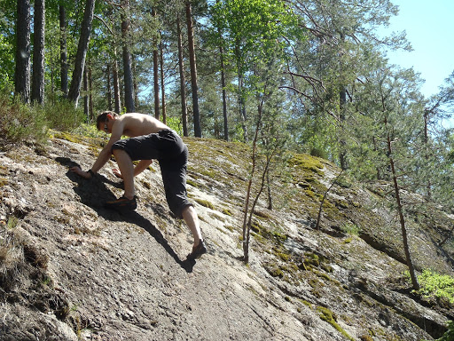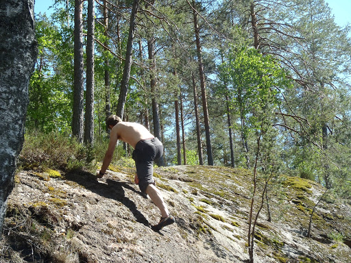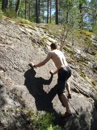 Kaitalammen reunojen sileät mukavan pyöreät kallioseinät suorastaan vaativat pientä släbitekniikan treenailuboulderointia leppoisan grillailun lomassa. Kalliot ovat pääosin melko sammaleisia, mutta puhtaitakin kohtia löytyy pienellä haeskelulla. Ko. alueella ei kuitenkaan varmasti ole kovin suotavaa ryhtyä kallioita puhdistelemaan, mutta pienikin pläntti riittää släbitekniikan mieleen palautteluun. Ja kun ei kovin pitkiä pätkiä lähde vetämään niin ei edes pelota. Kalliot ovat mukavan loivia, mutta silti pääsee ihan sopivasti testailemaan jalkatekniikkaa. Oheisessa kuvasarjassa allekirjoittanut näyttää hieman mallia…ja kun on saanut tarpeeksi kiipeilystä niin voi siirtyä grillailun pariin…