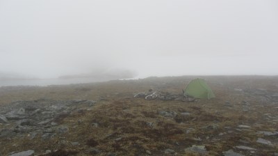 Noh, ei siinä mitään. Palattiin vanhaan leiripaikkaan ja laitettiin teltta pystyyn ja aloiteltiin parempien kelien odottelu. Tässä vaiheessa super pieni teltta tuli testattua ihan riittävällä tasolla niin ajanvieton että kelien osalta. Hurjempiin paikkoihin vehkeellä ei uskalla lähteä, mutta pelasi kuitenkin nyt ok eikä pää kilahtanut teltassa pari päivän makaamiseen. Seuraavana päivänä keli oli vielä mitä oli eikä takaisin juuri päästy vesisateen ja tuulien takia eli lisää teltassa makaamista, mutta seuraavana sitten rullailtiin myötäisessä Kautokeinoon ja poronkäristykset pöytään. Olo oli aika lyöty. Itsellä vaivaa olivat lähinnä vesisateessa kastellut kengät ja selän makuuhaavat. Ajot jäivät vähiin suunnitellusta, mutta kokemuksia tuli kyllä roppakaupalla. Normaalisti pyöräreissut ovat olleet kuitenkin jotain muuta kuin elementtejä vastaan taistelua.