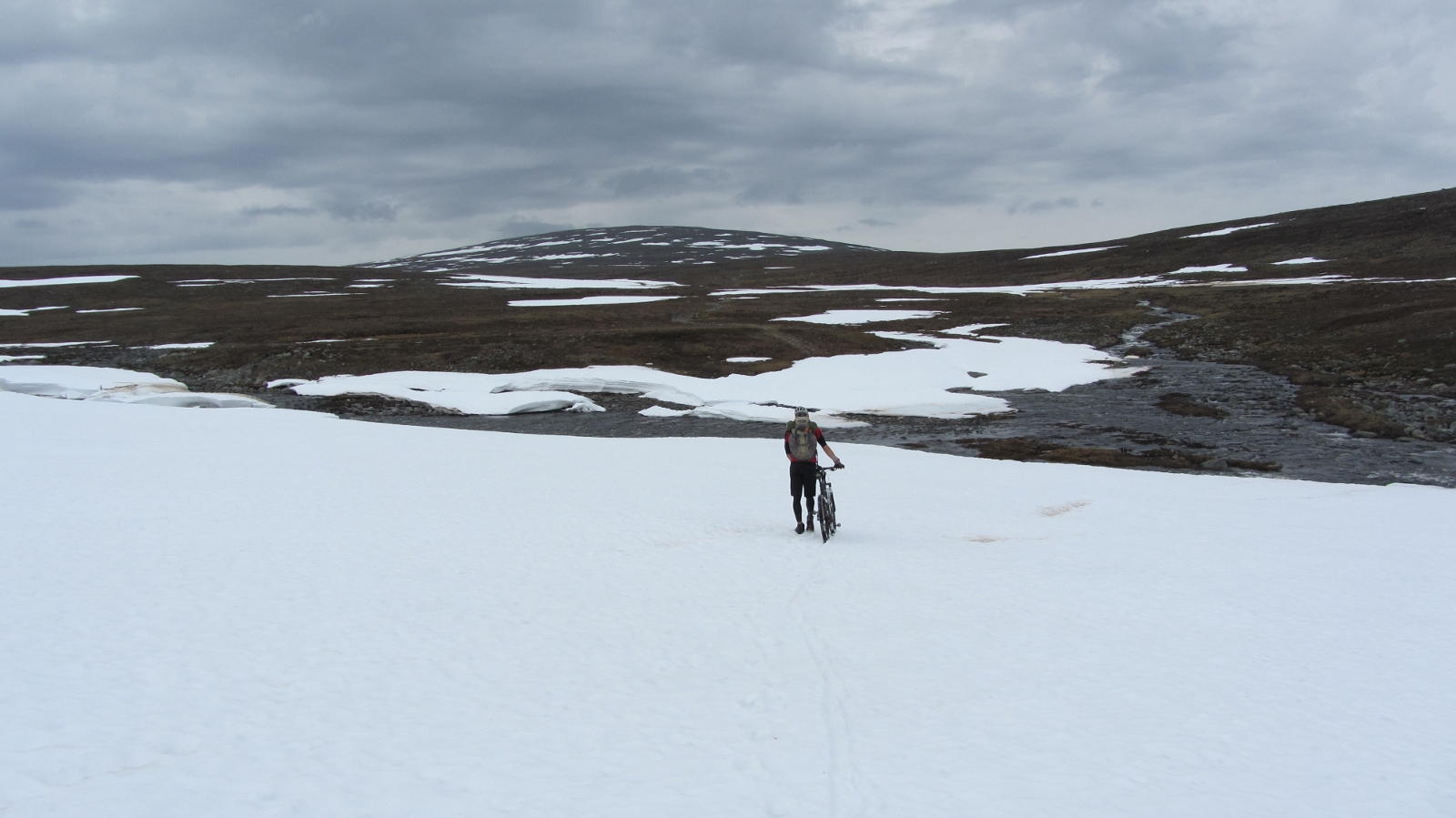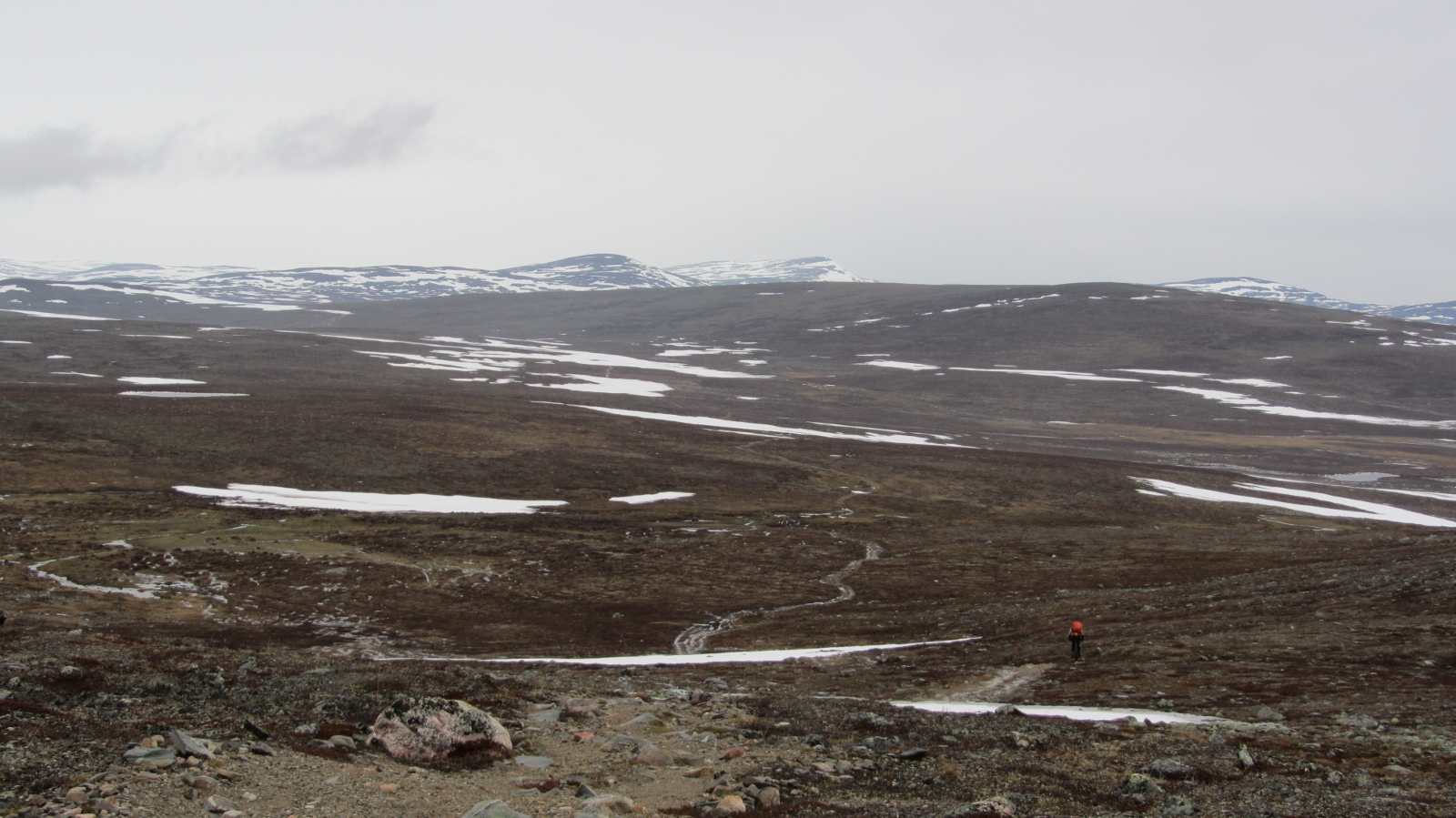 Teltassa tunturijärven rannalla toista päivää sateen ja tuulen sekamelskaa kuunnellessa tiesi, että nyt oli tullut haukattua liian suuri pala. Keli oli kova: näkyvyys heikko, vettä ja tuulta riitti eikä lämpötila kovin korkealle voinut nousta. Olimme käyneet kääntymässä ylempänä tunturissa olleen kosken rannalla, jossa ei enää riittänyt pokkaa lähteä eteenpäin ja hyvä näin. Keli oli kova. Tuulen ja veden yhdistelmä viilensi kropan nopeasti, lunta oli vielä paljon ja näkyvyys ei ollut kummoinen. Fiksumpi kaveri olisi toki tajunnut tämän jo aikaisemmin tutkimalla reittikarttaa ja sääennustetta: polku nousee lopussa ennen laskettelua Norjan vuonoihin lähelle tuhatta metriä, kesä tunturissa ei ollut vielä alkanut ja lupasihan se ennustuskin neljä päivää putkeen vettä taivaalta.