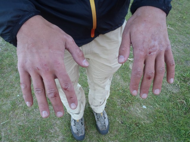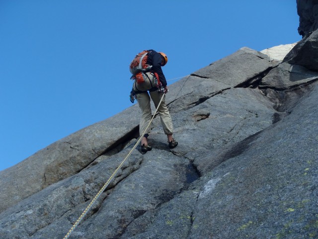 Koska reitin hienoimmat osat on kiivetty viidennen köyden pituuden jälkeen, päätimme laskeutua siellä olleista pulttiankkureista. Laskeutuminen toiselle ankkurille sujui kuin Italian peli, mutta sitten tökkäsi. Tuplaköysiä yhdistävä solmu onneton juuttui kallion koloon yläpuolellemme. Onneksi jonossa seuraavana oli varsin pätevä ruotsalainen kiipeilijä, joka laskeutui viidenneltä pultilta jeesaamaan ja ratkaisi ongelman. Jono pääsi taas eteenpäin. Loppu laskeutuminen sujui kuin tanssi, tosin köysi ei ihan alas asti riittänyt ja viimeinen hivuttautuminen pienessä jyrkässä kurussa oli ehkä päivän vaarallisin osuus.