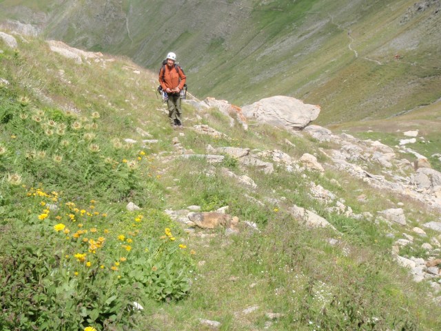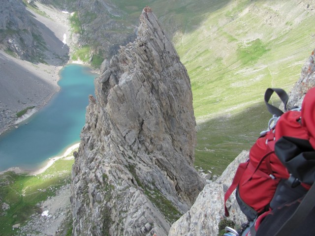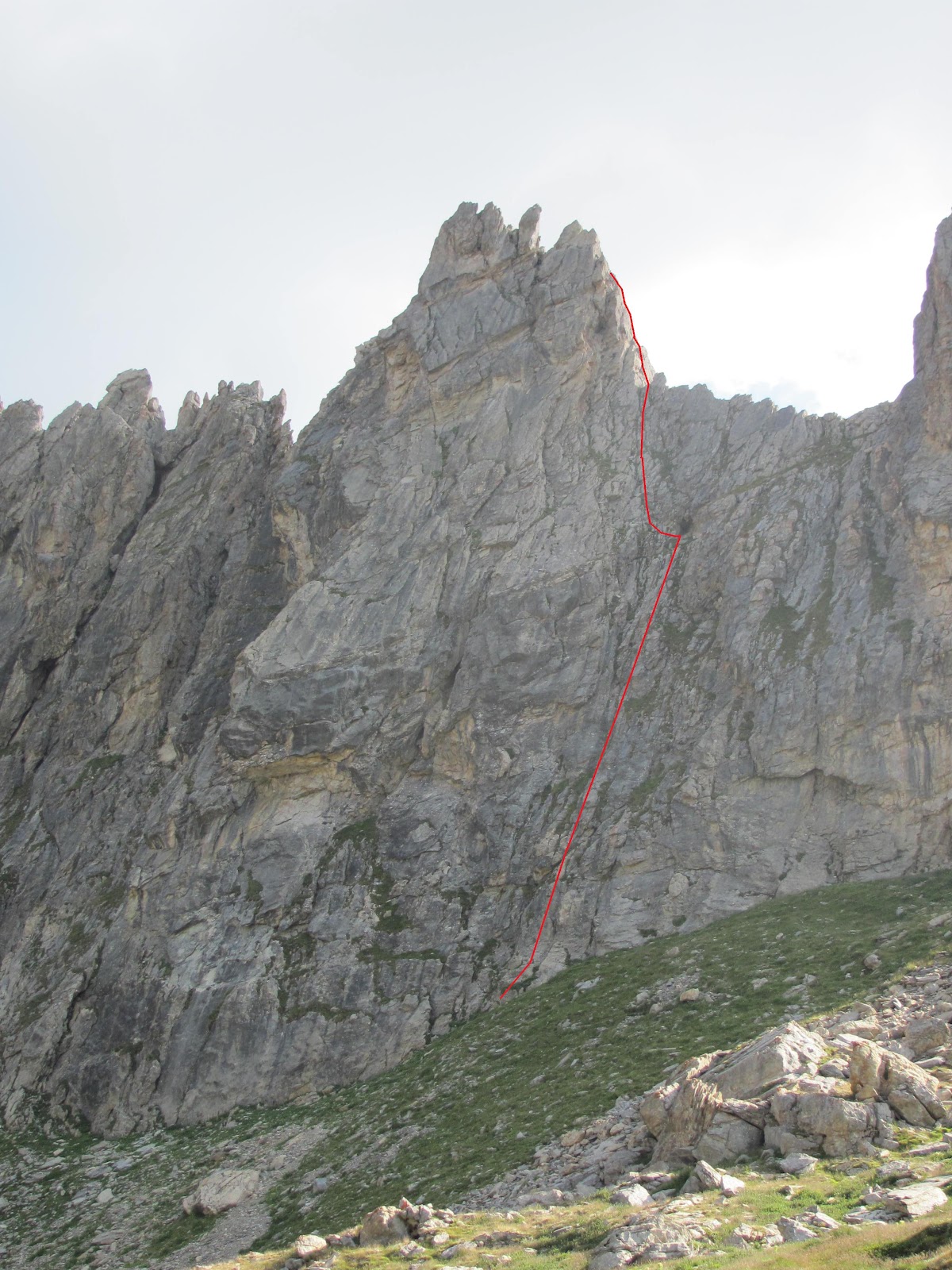 Ensimmäinen kp oli huonosti varmistettavaa irtokalkkikiveä ja ruohotupsuja. Jos se olisi ollut vaikeaa, olisi jäänyt kiipeämättä. Varmistuksia haeskellessa ja irtokiviä varoessa kiipeily oli suht. hidasta hommaa. Kahden kp:n eli n. 100 m:n jälkeen todettiin kellon olevan niin paljon, että jos tästä jatketaan, heti ensimmäisestä kiipeilypäivästä tulee eeppinen. Reitti on helppo, mutta monivaiheinen. Rutiinien puutteessa matkaan menee huomattavasti suosituksia enemmän, joten päätimme palata samaa reittiä takaisin, nyt kun sen pystyi vielä tekemään. Myöhemmin ei enää kannattaisi kääntyä takaisin. Tässä kohtaa tuli myös selväksi, miksi ne aikaiset alppilähdöt on ihan järkeviä.