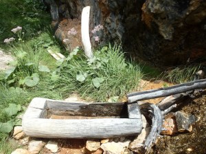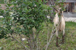 Hoitokodin jälkeen lähdettiin nousemaan mukavassa alppikuusikossa upeiden vuorten keskellä kohti agriturismoa, joka siis myös harrastaa meijeritoimintaa (tietää sitä, että nimessä on sana ”malga”). Ihmisiä ei juuri näkynyt, isä poikiensa kanssa tuli maastopyörillä vastaan ja lopussa ohitettiin italialainen perhe, mutta agriturismolla oli kyllä autolla tai muita reittejä saapuneita lounasvieraita runsaasti. Syötiin itsekin ja ruoka oli erinomaista, samoin alueen kuuluisa prosecco. Samaan aikaan ilmeisen erinomaista lounasta nauttivat kaksi talon vuohta, jotka tekivät selvää sekä kukkaistutuksista että pihapensaasta, olikohan ne ihan luvallisilla asioilla?