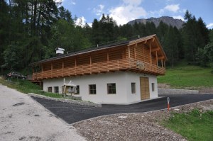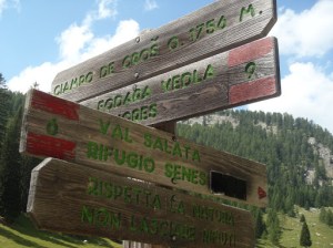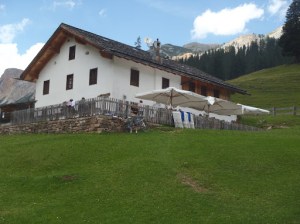 Ensimmäisenä vaelluspäivänä lähdettiin kävelemään suoraan hotellin ovelta kohti Agriturismo Malga Larietoa. Ensi käveltiin kylän raittia ja käytiin lähikaupasta pari banaania ja vettä evääksi. Ensimmäinen tavoite oli löytää joku hoitokoti, jonka pihalta lähti polku nousemaan vuorille. Kohtuullisen vähäisen haeskelun jälkeen hoitokoti löytyi ja päästiin toteamaan, että hoitokodin pitäminen on ilmeisesti kannattavaa, kun joku ylilääkärin näköinen kaveri lääkärin takki viuhuen parkkeerasi hienon urheiluautonsa hoitokodin pääoven eteen parkkikieltoalueelle…no ehkä siinä oli juuri siksi parkkikielto, että ylilääkäri voi parkkeerata…