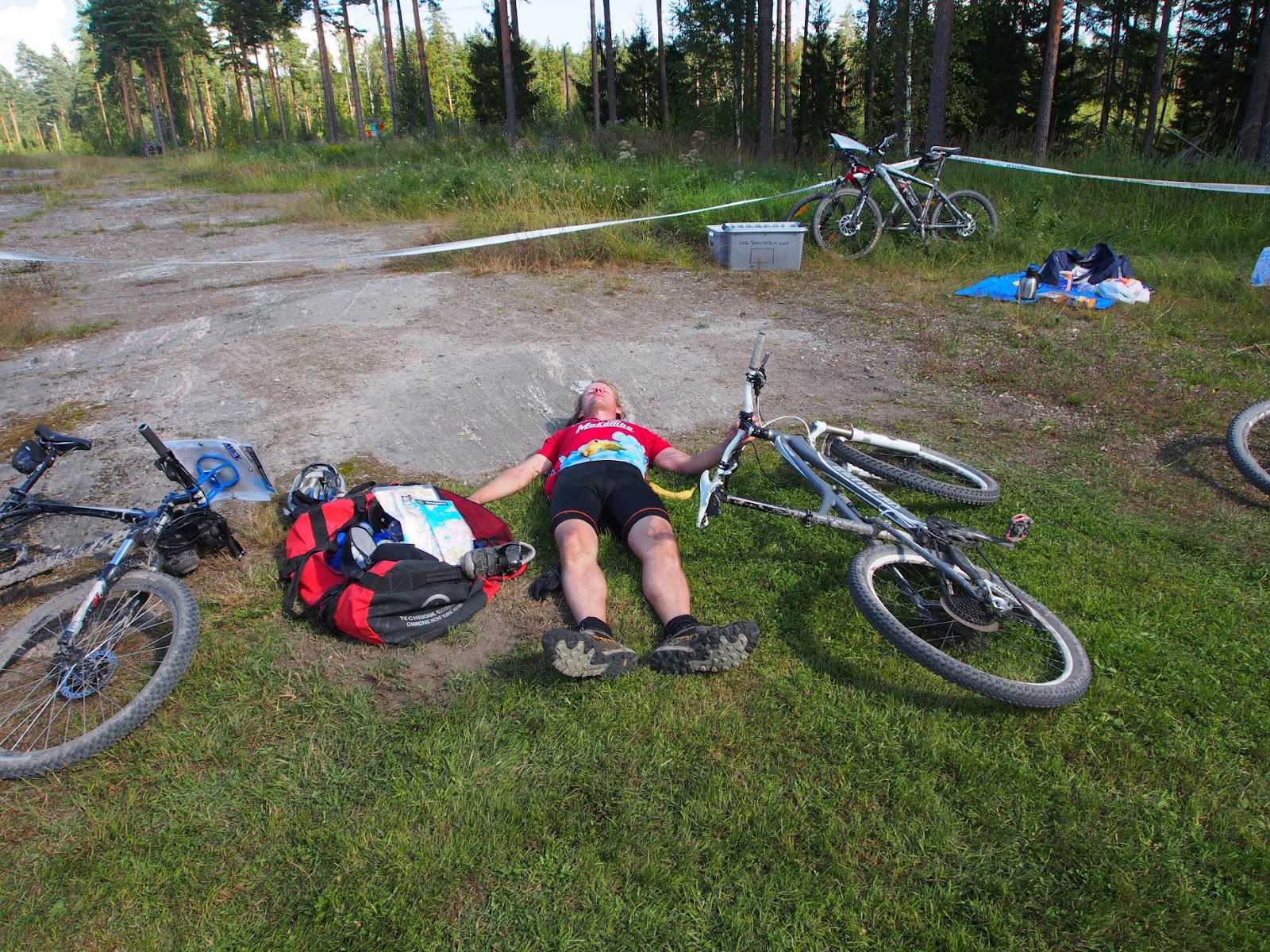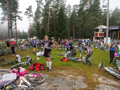 Pyöräilyn alkupuolisko oli mukavaa pientä tietä ja metsäautouraa, jolla pääsi jo muutamassa rapakossa maastoajon makuun. Valitettavasti Jaken pyörän voimansiirto oli vähän kohmeessa ja vauhdista ei päästy nautiskelemaan ihan niin paljon kuin olisi voinut. Itse asiassa Jake pelästytti minut jo pyöräilyn lähdössä vetämällä nokalleen kisakeskuksen parkkipaikalla ketjujen vähän pomppiessa. Loput reitistä meni oikein nätissä maalaismaisemassa. Quest oli ihan kiva ohjelmanumero, mutta itse en nilkkavaivaisena hirveästi digannut pienestä välijuoksusta pyöräilykengillä.
