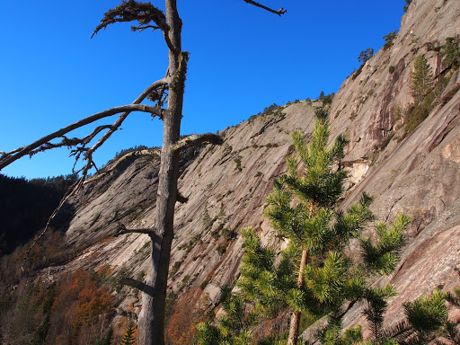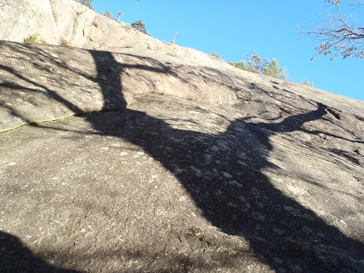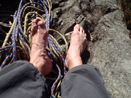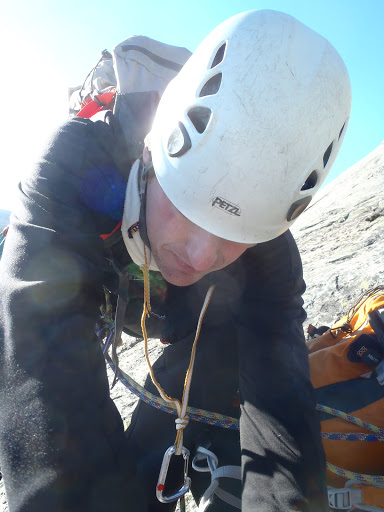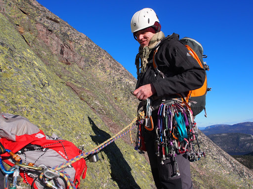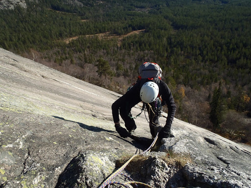 Kallion juurella kuitenkin valui hiki, nousu oli kovahko. Ja aurinko lämmitti mukavasti. Mikko lähti ekana, kun Mikko tykkää liidata aina ekat koopeet. Ekat 2 kp:tä olivat kokonaan pultattua släbiä. Tänä kesänä, tai siis viime kesänä ja tänä syksynä, onkin tullut vedettyä släbiä urakalla, alkaa homma sujua, joten sujui nytkin, Mikon eka liidi meni hienosti, samoin minun seuraava, pultilta toiselta släbillä tepastellen. Aurinko lämmitti sen verran, että minä heitin hanskat heti mäkeen…tai taskuun siis, eikä paksut sukat tossuissakaan haitanneet.