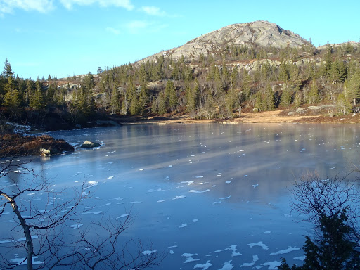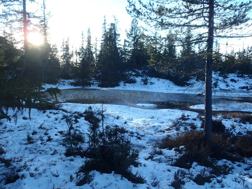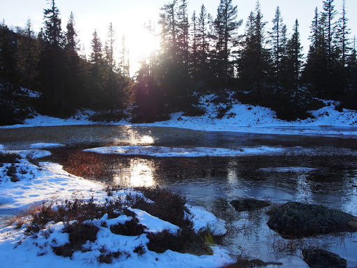 Tunturin laki olikin sit tosi upea! Mielettömiä kalliomuotoja, jäätyneitä lammikoita ja lumilaikkuja. Pienen tauon jälkeen jatkettiin huipulle ja sieltä alas polkua pitkin. Tuli oli melko kova, mutta eipä se haitannut maisemia, jotka oli upeat! Pikku lammikoita jäässä, lunta siellä täällä ja vapaan virtaavia puroja. Mikko totesi yhden kauniin lammen äärellä, että maisema on kuin joulusadusta, hetkenä minä hyvänsä lampi voi täyttyä luistelevista keijukaistytöistä ja maahisista ja joulupukki kurvaa tunturin takaa…maagista seutua tämä Norja!