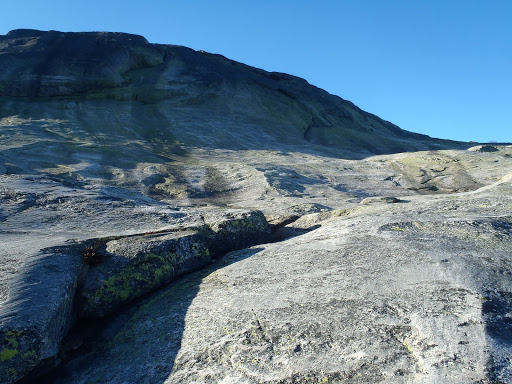 Ruuat ja kamat heitettiin mökkiin ja suunnattiin samantien kohti Haegefjelliä, jossa odotti seuraavaksi päiväksi ajateltu kiipeilyreitti. Viimeiset kilometrit ajeltiin hiekkatietä ja eikös paikallinen tienhoitaja ollut päättänyt juuri sinä päivänä kaataa pehmeää hiekkaa tien täyteen. Tähän hiekkakasaan minä tietysti karautin Toyotalla ja ei ollut Toyota maineensa veroinen, joku ihmeen muovilista irtosi melkeen kokonaan keulasta, höh. Loppumatkan se sitten kolasi kaikki kivet jonnekin moottoritilaan raahatessan maata puoliksi irti roikkuen.
