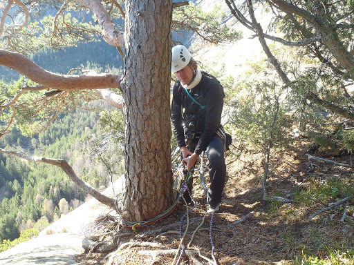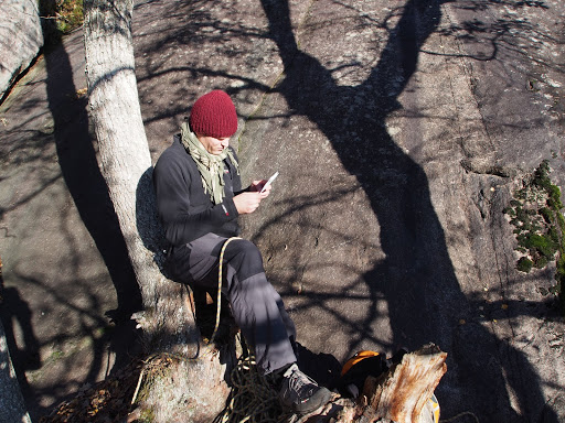 Kolmosen jälkeen minä jatkoin liidausta lyhyen trädikoopeen, siinä ei sen kummepia ongelmia ollut, samoin pari seuraavaa pätkää meni ongelmitta, keli oli kaunis ja reitti suojassa tuulelta. Lämpötila oli vähän pakkasen puolella, mutta pakkasta ei edes huomannut. Sohlojen kiipeilyt harvoin ovat kuitenkaan täysin ongelmattomia. Kuudennella ständillä kuvailimme videota, joka päättyi toteamukseen, että emme täysin tiedä mihin reitti jatkuu, mutta johonkin ylöspäin. Niinhän siinä taas kerran kävi, että kahdelta kiipeilijältä jäi näkemättä kaksi pulttia muutama metri ständin yläpuolella ja Mikko lähti liidaajana kiertelemään ties minne päätyen lopulta naapurireitin pulteille. Näiden pulttien ja trädikaman avulla Mikko hivuttautui ylöspäin, kunnes huomasi meidän reitin pultit. Ongelma oikeastaan oli se, että me luultiin ettei reitillä ole pultteja enää kolmos pätkän jälkeen, joten ei osattu etsiä pultteja. No pultteja oli ja harhaan mentiin. Lopulta Mikko onnistui hivutamaan itsensä oikealle ständille, ei helpointa reittiä, mutta kuka niitä laskeskelee. Pieneksi ongelmaksi meinasi muodostua köyden riittävyys. Kp oli muutenkin 60 metriä, ja meillä siis 60 metriset köydet, ja siihen kun lisättiin Mikon ekstralenkit niin tiukille meni, mutta riitti.