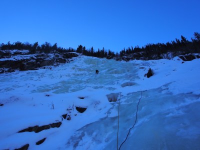 | Päivän putous. Tuosta aikalailla oikeaa laitaa myötäillen aina viimeiseen haaran toppiin saakka. Oikeastaan ainoa jyrkempi pätkä oli ylähaaran vasen laita. Muuten aaltoilevaa paksua jäätä. |