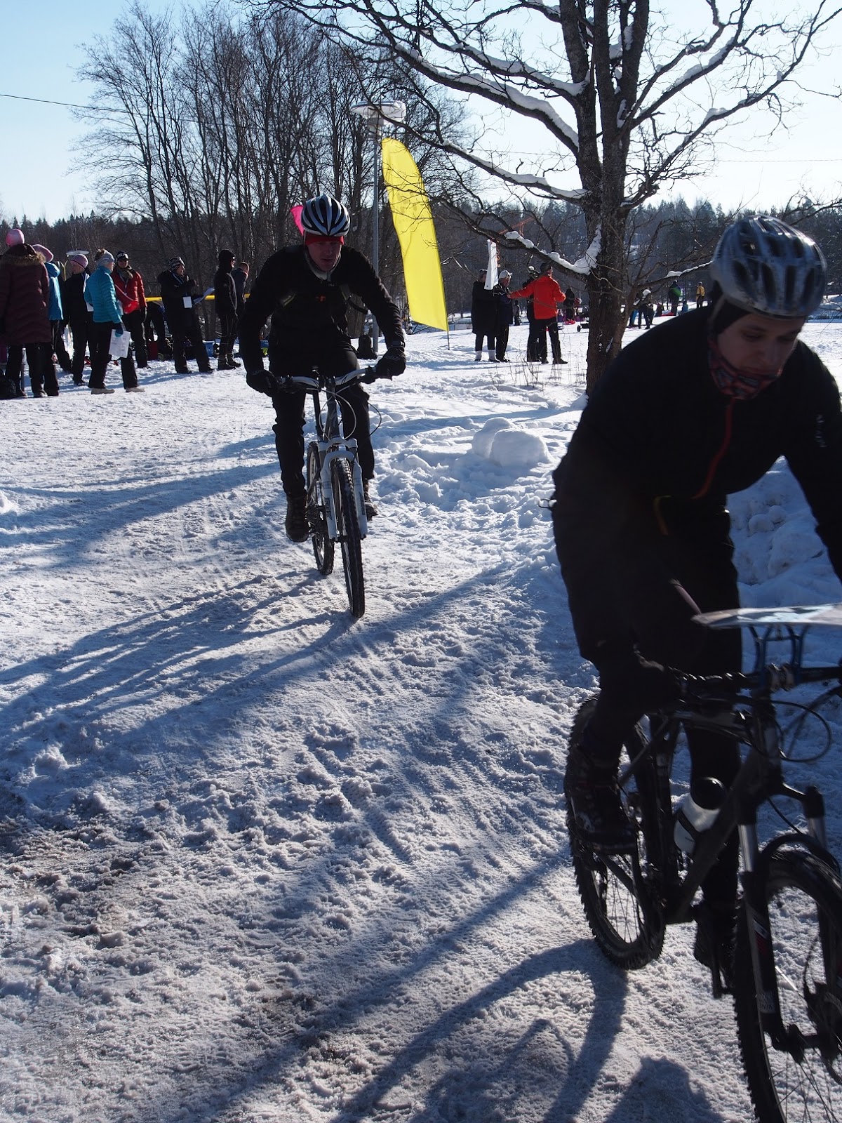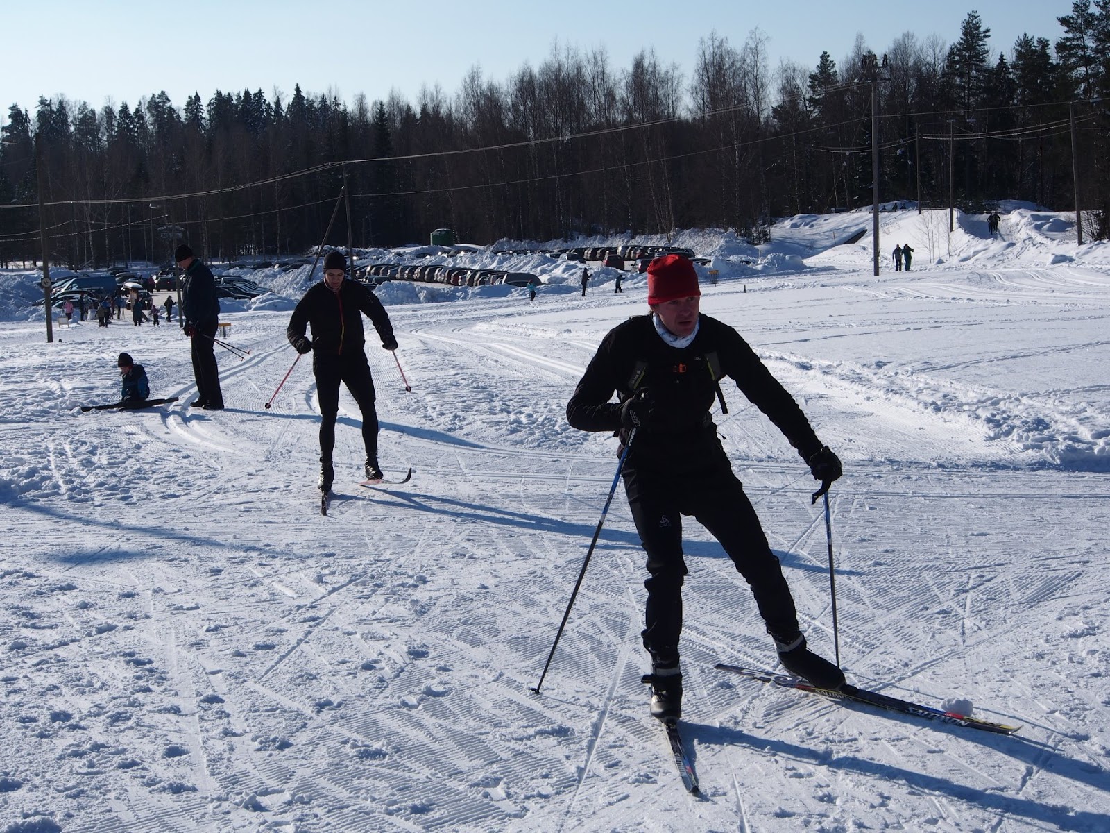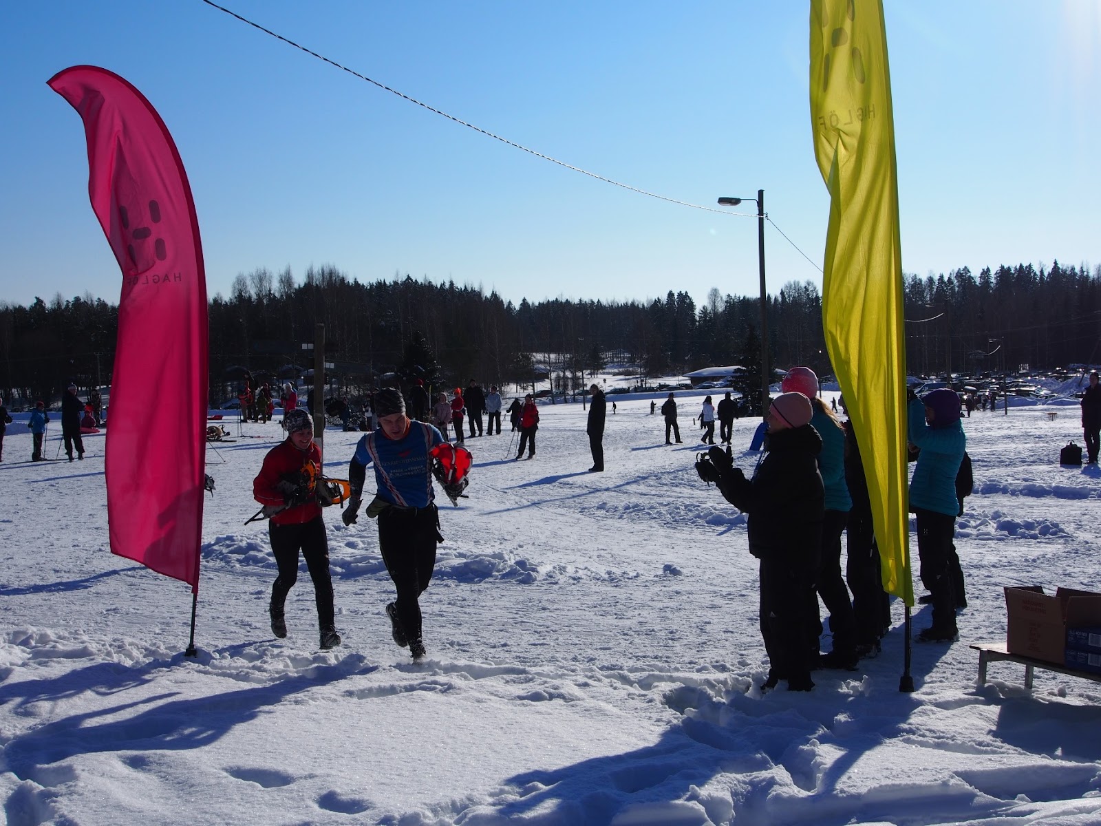 Me taas tehtiin töitä seitsemän ja puoli tuntia. Tai siis ainakin minä tein. Otti jälleen kerran suht koville. Liikkuminen talvella on raskasta hommaa ja kun sitä tekee yhtä matkaa Jaken kanssa, tietää saavansa kunnon haasteen. Startti oli seiskalta Oittaalta. Ensimmäinen laji oli muistisuunnistus, joka oli pääasiassa taajamassa juoksua, mutta silti onnistuttiin toinen väli vetäisemään kiertotietä. Yksi rastiväli tarvottiin syvässä hangessa jalanjälkiä pitkin, jolloin pääsikin aika helposti punaiselle. Toisena lajina oli sitten hiihtoa. Minulla oli luonnollisesti luistelukamat kun en muuta omista ja täytyy sanoa, että oli aika hapokasta. Oittaan lenkki meni vielä ainakin suht kevyen tuntuisesti, mutta Nuuksion puolella kapeammilla ja pehmeämmillä laduilla alkoi voimat valumaan lumeen. Yli kaksi ja puoli tuntia tuli riuhdottua aivan liian kovilla tehoilla ja vaihtoon tullessa oli tattis. Reitti oli kyllä hieno ja keli komia. Varsinkin nelos rastin auraamaton ura oli hieno, jos olisi ollut pertsat tai edes jonkinlaiset sommat sauvoissa. Lisäksi päivän kuluessa pidemmälle alkoivat espoolaiset kaivautua rivareistaan Oittaalle ja takaisin päin hiihdettäessä oli jengiä jo melkoisesti ladulla. Siinä sitten survottiin ylämäkiä tasatyönnöllä. Olisi pitänyt tajuta jossain vaiheessa, että nyt mennään liian kovilla tehoilla.