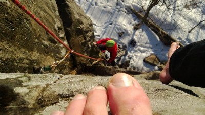 Kauden avaus Rollareilla. Aluksi oli idea mennä fiilistelemään ja teknoamaan, mutta keli oli sen verran hyvä ettei kiipeilytossuja voinut olla vetämättä jalkaan. Kallio oli jopa lämmin ja halkeamat kuivia siellä missä vesi ei valunut topin kinoksista. Ja valumat oli muutenkin sen verran pieniä puroja ettei ne haitanneet menoa. Suurin osa linjoista oli ok.