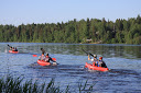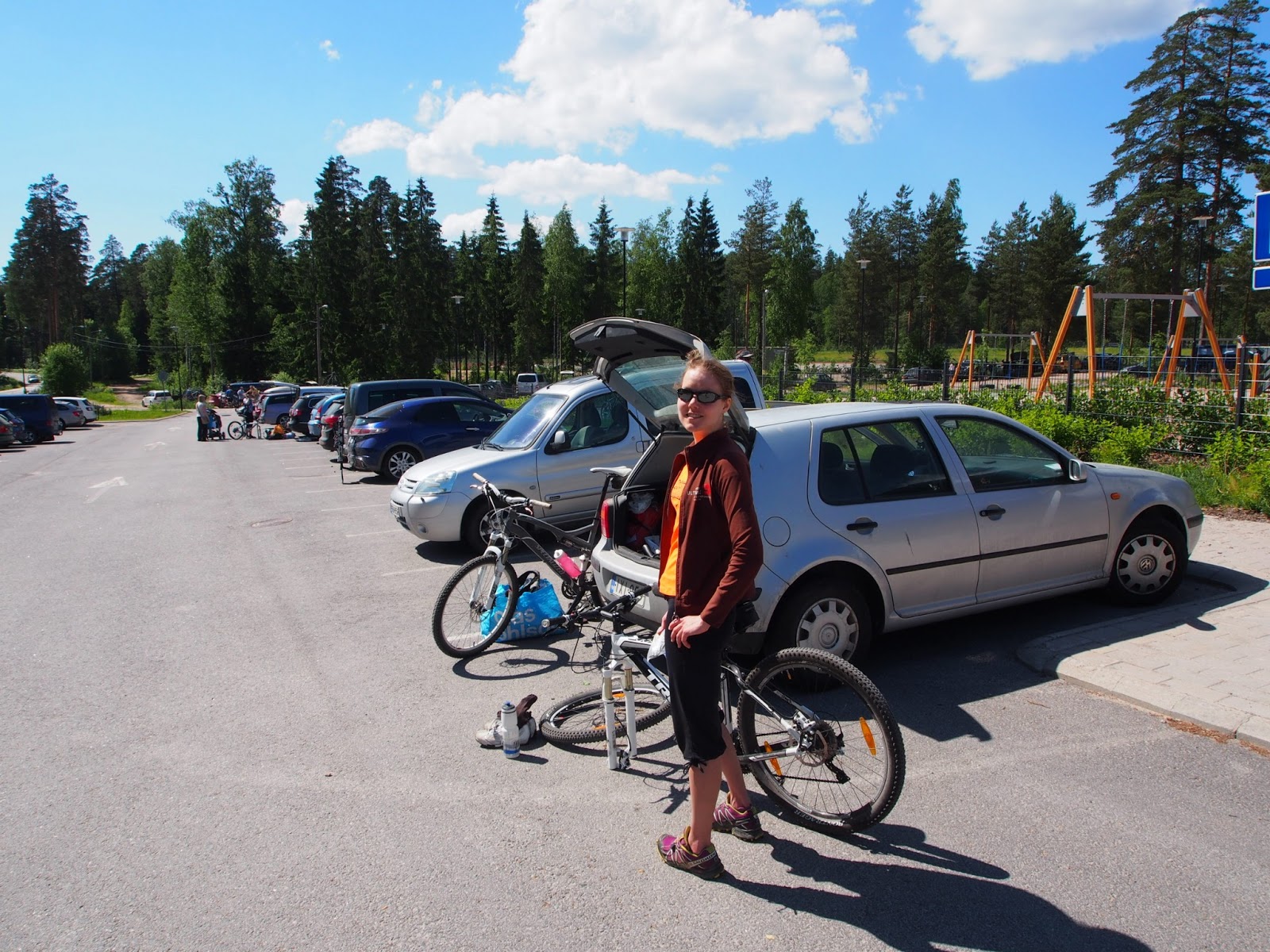 Yllättävä ehjin nahoin motocrossista selviytyminen ilmeisesti innoitti Mikon tekemään uusia reittisuunnitelmia, koska seuraavalle pyörärastille suunnattiin reittiä kaavaillessa tunkkaus-pätkäksi oletettua metsäosuutta pitkin. Plan A oli mennä tietä pitkin, koska metsän läpi oikaiseminen minun kanssa harvoin säästää aikaa. Tällä kertaa maastopyöräily yllättäen sujuikin ihan hyvin, tai ainakaan en kaatunut enkä edes taluttanut paljoakaan. En tiedä johtuiko viime viikolla poljetuista 120 asfalttikilometristä vai aikataulupaineista, mutta hetkittäin tuntui siltä että jopa hallitsi pyörän menoa. Maastopyöräilyssä oli sekin hyvä puoli, että pään tehdessä töitä reittiä hakiessa ei muistanut olevansa väsynyt. Maasto-osuuden jälkeen ei enää ollutkaan pitkää matkaa lajin vaihtoon, ja seuraavaksi päästiin ihan kunnolla lepuuttamaan jalkoja melonnassa.