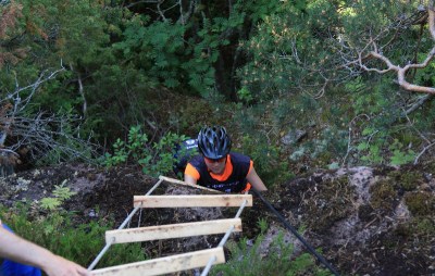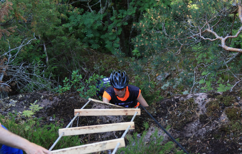 Kilpailun prologina oli 4 kierrosta 400 metrin aitajuoksuesteillä höystettyä juoksurataa, joko viestinä tai koko joukkueen voimin. Juoksun päälle piti vielä löytää kaksi rastia juoksuradan läheisyydestä, joista toista etsittiin hyvän aikaa väärästä päädystä ennen kuin tajuttiin että rastin jippona oli lukea karttaa peilikuvana. Ei siis oltukaan erityisen nokkelia, kun lähdettiin ekalta rastilta aivan toiseen suuntaan kuin moni muu joukkue.. Turha pummaus harmitti, mutta pyörän päälle hypättyä ei enää vanhoja muisteltu vaan lähdettiin etsimään seuraavia rasteja. Heti toinen rasti oli hauskasti sijoitettu järveen, niin että seuraavalle rastille saatiin jatkaa mukavasti järvivedellä viilennetyt vaatteet päällä. Mikolla oli ilmeisesti hyvin aikaa lukea karttaa minua odotellessaan, koska rasti toisensa jälkeen löytyi kuin vakiostettavat lähikaupan hyllyltä. Lisäksi meillä oli Kauhalan maastoissa hienoinen kotikenttä-etu kaiken ympäristössä harrastetun kiipeilyn ansiosta. Ongelmia tuli vasta siinä vaiheessa kun piti köysi-questin jälkeen suunnistaa puronvartta pitkin ilman karttaa, ja löytää 3 rastia ihan vaan puronpenkkaa tiirailemalla. Ensimmäisessa rastissa vaan ei ollutkaan ollut lippua, joten painettiin sokkona puskissa olleen emitin ohi ja etsittiin sitten kolmatta rastia puron väärästä päästä. Onneksi sentään tajuttiin lopulta luovuttaa ja ottaa sakot yhdestä rastista, mutta nokkos- ja muissa puskissa rymytessä kului silti hyvä siivu sekä aikaa että energiaa.