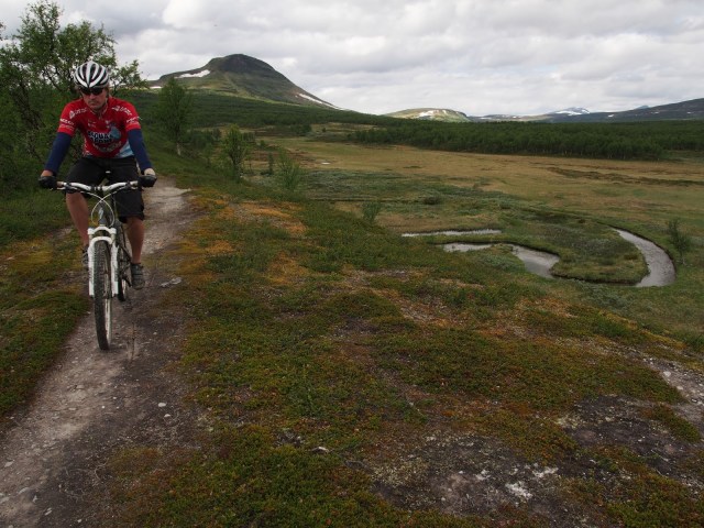 Ylämäkeen tosin oli puskettava joka tapauksessa, joten eipä sillä todennäköisesti ollut suurempaa väliä kummalla reitillä pyöriä tunkattiin. Ylämäen vihdoin loputtua päästiin nauttimaan upeasta tunturimaisemasta ja pieni tuulenvire karkotti himokkaat verenimijätkin pois kimpusta. Koko ylätunturissa kulkeva osuus ja erityisesti lasku alas Djupdalsvallenin tunturituvalle oli paikallisia lainaten ”helt pärla”, jopa aloittelijakin pystyi täysillä nauttimaan menosta.