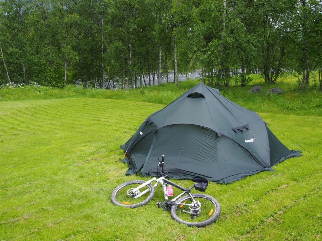 Saavuttiin Hemavaniin keskellä yötä, ja alkuvaikutelma paikasta oli aika nihkeä. Kylä oli yhtä elävän oloinen kuin vesipuisto talvella, eikä campingiin ollut asiaa ilman karavaanaria. Viereisestä Tärnabyn kylästä onneksi löytyi oikein viihtyisä leirintäalue tunturijoen varresta ja saatiin teltta pystyyn juuri ajoissa ennen aamuyölle luvattua sadetta. Aamulla sitten nukuttiin senkin edestä mitä ei illalla ehditty, mutta ehdittiin silti päivän aikana sekä asioimaan Tärnabyn kylillä että polkaisemaan reipas 40 kilsan kuntolenkki pääasiassa hiekkateitä pitkin. Reitin loppuosuus maantietä pitkin oli uuvuttavaa vesisateessa vastatuuleen puskemista, kakkosena peesaillessakin alkoi viimeisellä kympillä olla energiat vähissä ja varpaat jäässä. Perillä leirinnässä onneksi päästiin kunnon saunaan lämmittelemään, ja sen jälkeen kokkailemaan fiinisti oikein keittiötiloissa.