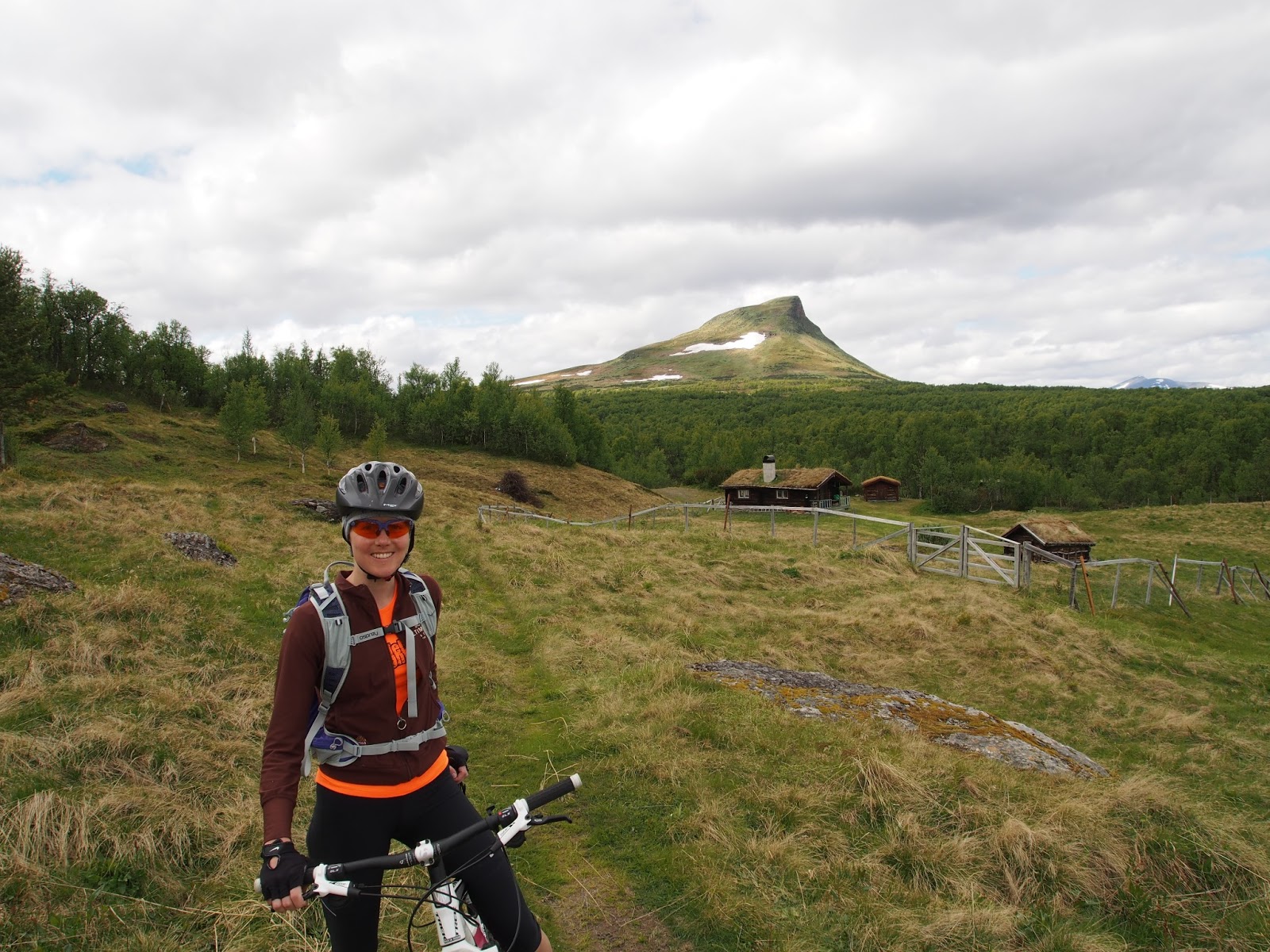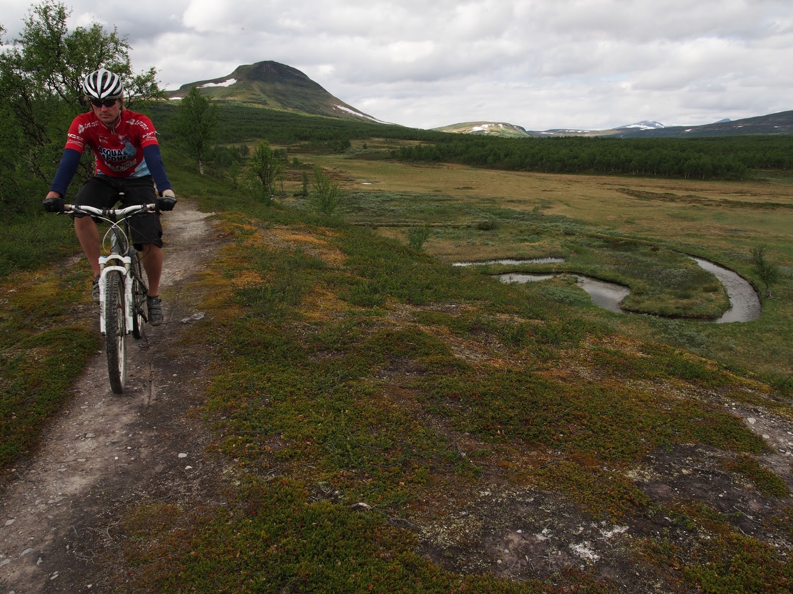 Hemavan-Tärnabyn maisemat ovat jo melko jylhiä, suuria tuntureita siintää horisontissa lähes joka ilmansuunnalla. Luntakin näkyi ylärinteillä vielä olevan, mutta laaksossa oli pilvisenäkin päivänä kesäinen lämpötila. Toisena Hemavanin päivänä jakauduttiin eri reiteille, jotta kumpikin pääsisi polkemaan yhden omaa tasoa vastaavan ylätunturissa kulkevan polun. Mikko lähti yrittämään haastavampaa reittiä Forsavanin ja Syterstuganin tuvan kautta Kungsledenille ja edelleen Hemavaniin, minulle riitti varsin hyvin haastetta 24 kilsan maastoreitissä Forsavanin tuvalle ja takaisin. Hiihtohissit eivät vielä juhannusta edeltävällä viikolla olleet käytössä, joten tunturiin päästäkseen piti taas varautua tiukkaan ylämäkitreeniin. Hyttysarmeijan siivittäessä menoa selviydyin alun nousu-urakasta kolmessa vartissa, ja pääsin hikisenä ylös tunturiin aloittelemaan varsinaista pyöräilyosuutta.