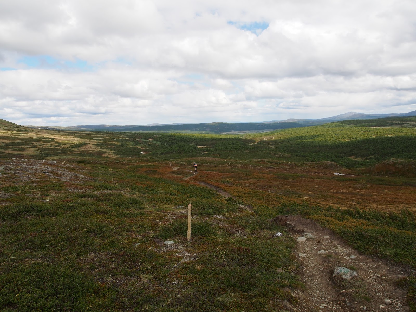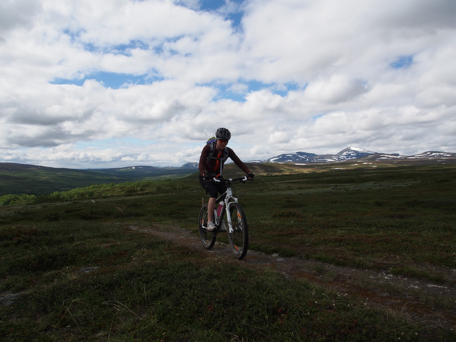 Ylämäkeen tosin oli puskettava joka tapauksessa, joten eipä sillä todennäköisesti ollut suurempaa väliä kummalla reitillä pyöriä tunkattiin. Ylämäen vihdoin loputtua päästiin nauttimaan upeasta tunturimaisemasta ja pieni tuulenvire karkotti himokkaat verenimijätkin pois kimpusta. Koko ylätunturissa kulkeva osuus ja erityisesti lasku alas Djupdalsvallenin tunturituvalle oli paikallisia lainaten ”helt pärla”, jopa aloittelijakin pystyi täysillä nauttimaan menosta.