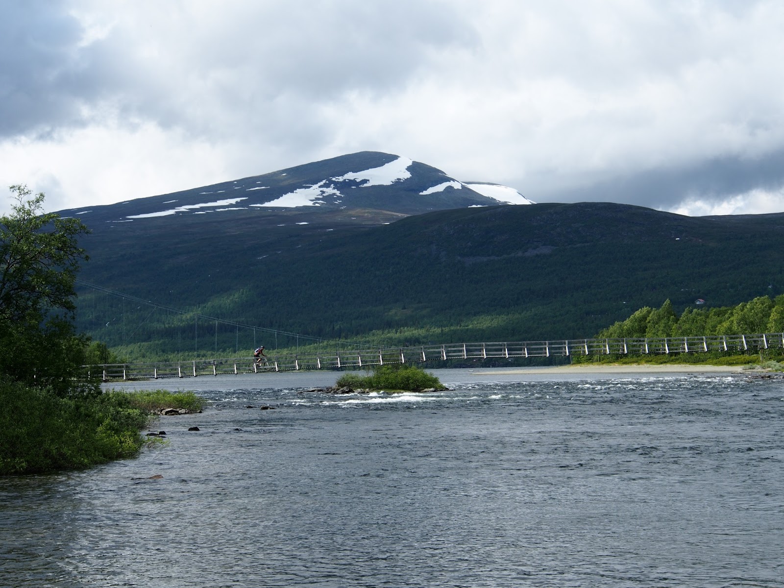 Saavuttiin Hemavaniin keskellä yötä, ja alkuvaikutelma paikasta oli aika nihkeä. Kylä oli yhtä elävän oloinen kuin vesipuisto talvella, eikä campingiin ollut asiaa ilman karavaanaria. Viereisestä Tärnabyn kylästä onneksi löytyi oikein viihtyisä leirintäalue tunturijoen varresta ja saatiin teltta pystyyn juuri ajoissa ennen aamuyölle luvattua sadetta. Aamulla sitten nukuttiin senkin edestä mitä ei illalla ehditty, mutta ehdittiin silti päivän aikana sekä asioimaan Tärnabyn kylillä että polkaisemaan reipas 40 kilsan kuntolenkki pääasiassa hiekkateitä pitkin. Reitin loppuosuus maantietä pitkin oli uuvuttavaa vesisateessa vastatuuleen puskemista, kakkosena peesaillessakin alkoi viimeisellä kympillä olla energiat vähissä ja varpaat jäässä. Perillä leirinnässä onneksi päästiin kunnon saunaan lämmittelemään, ja sen jälkeen kokkailemaan fiinisti oikein keittiötiloissa.