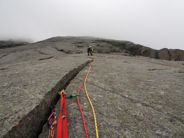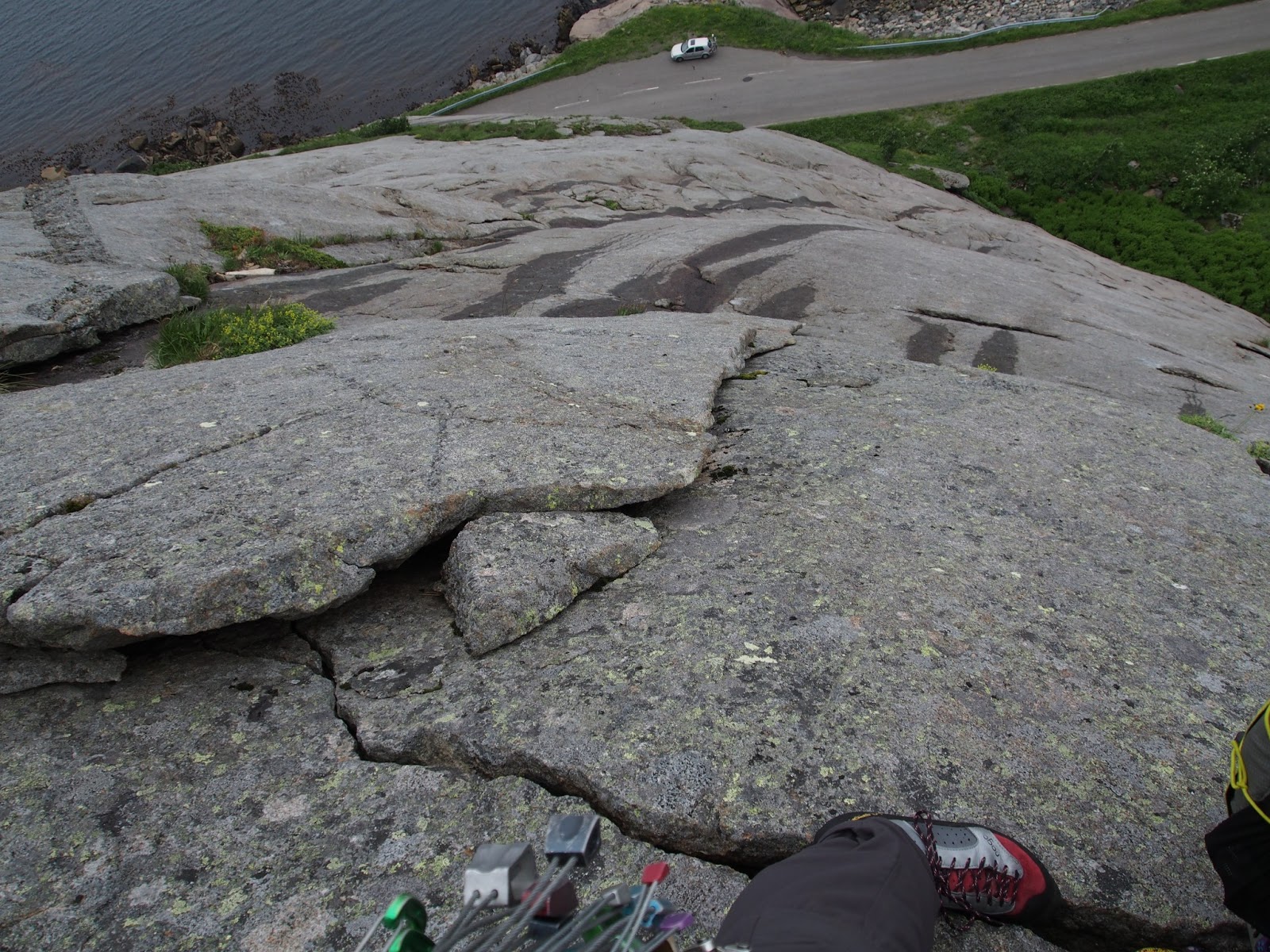 Ensimmäinen kp meni mukavasti släbillä. Runittamista riitti, mutta eteneminen oli sen verran loivaa ettei varmistusten vähyys niin haitannut. Vasta korkeuden lisääntyessä oli pakko alkaa rakentamaan luottamusta pieniinkin kamuihin, muille ei juuri ollut saumaa mistään kiiloista puhumattakaan. Reitti oli kuitenkin selkeä, ja oli kivaa kiivetä taas pitkästä aikaa. Mikko jatkoi liidausta seuraavalla kp:llä, joka ei tainnut vielä paljon jyrkentyä mutta reittiä joutui hieman hakemaan. Kunniakkaasti selvittiin siitäkin, samoin kolmannesta kp:stä jolla toisin jouduin harjoittelemaan alaspäin pakittelua kun sormihalkeamaan ei enää mahtunut pikkurilliäkään. Parempi reitti seuraavalle ständille löytyi halkeaman vasemmalta fleikin reunaa seuraten, ja Mikko jatkoi taas liidaamista neljännelle kp:lle. Viides kp oli harvinaisen nihkeä, pelkkää loivasti ylöspäin menevää puskaa ilman mitään varmistuspaikkoja. Kiipeilyosuuden paras ote oli pikku pihlaja, toiseksi paras katajan juuri..eikä koko kp:lle tainnut saada kuin yhden surkean kiilan ja yhden onneksi hyvän kamun. Ankkurille päästyä olin hyvin iloinen jälleennäkemisestä kiinteän kallion kanssa, kostean liukas ruohohylly kiipeilytossujen alla on harvoin miellyttävä kokemus. Mikko samoili kakkosena saman pusikon läpi ankkurille, ja jatkoi matkaa huomattavasti laadukkaammalle kuudennelle kp:lle jonka aikana tosin alkoi satamaan vettä.
