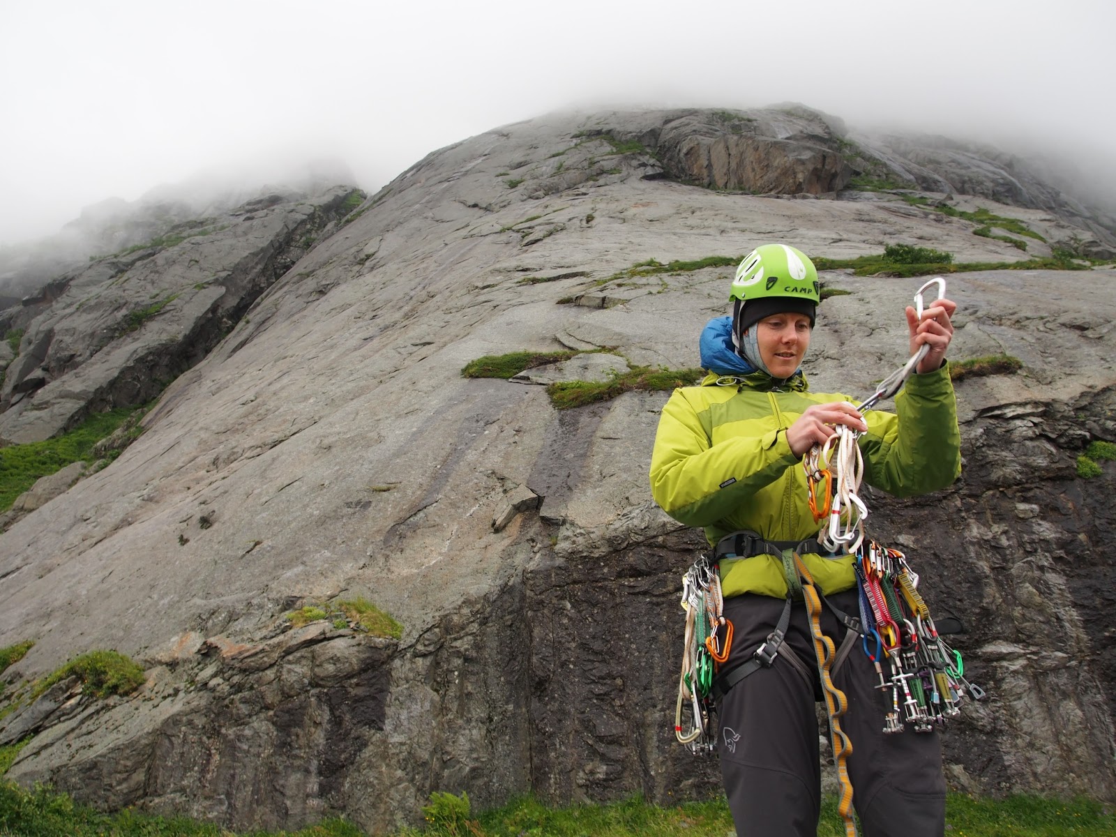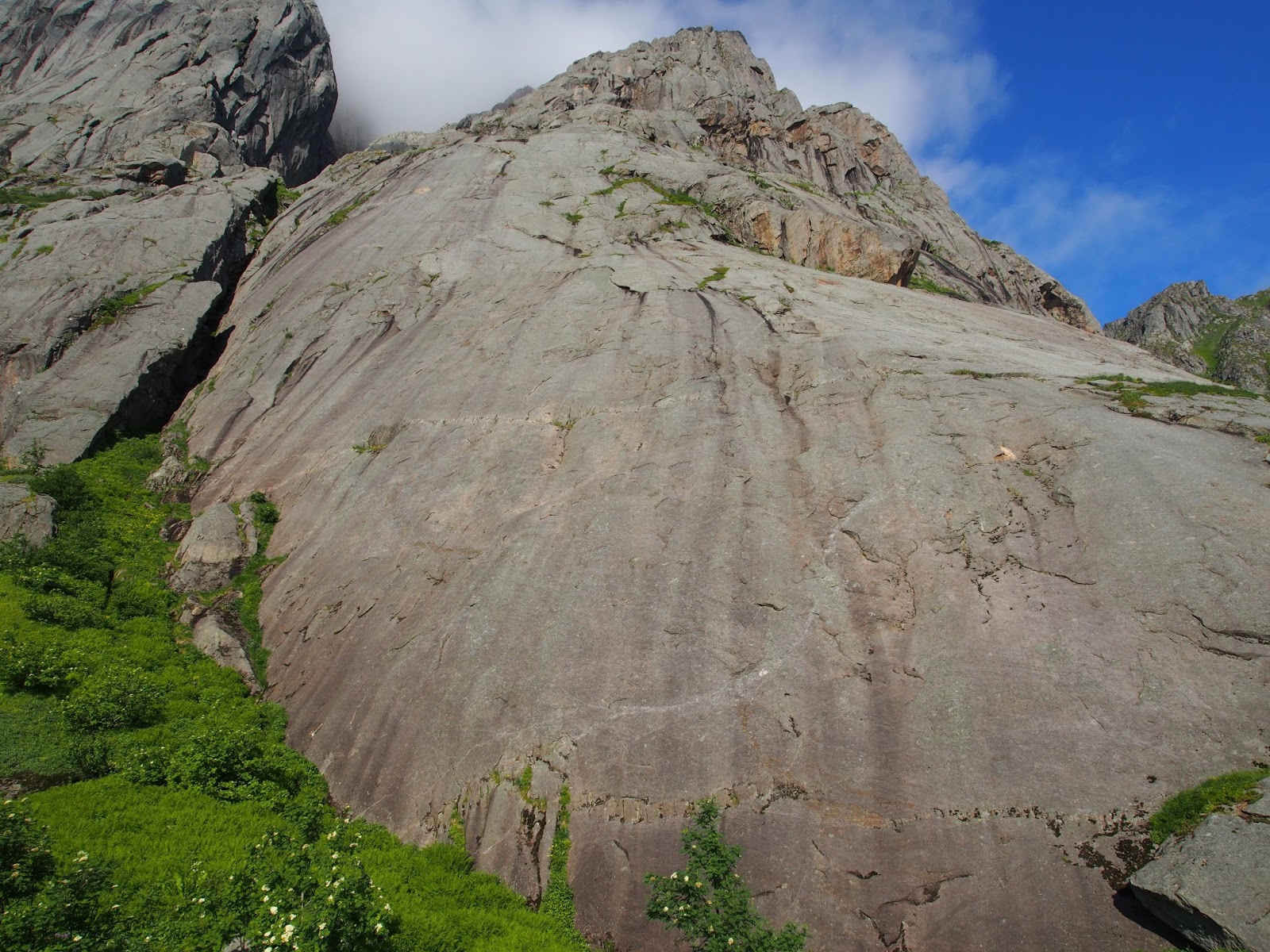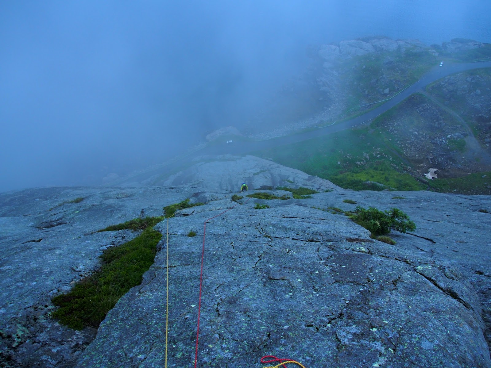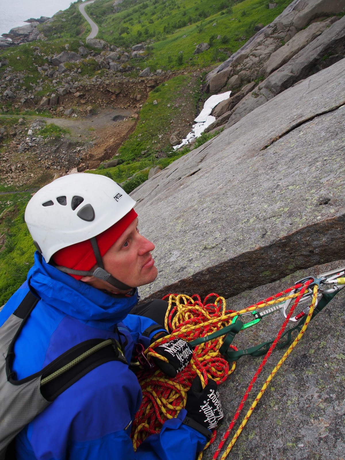 Å:n turistikierroksen ja kalakeiton jälkeen tultiin uudestaan reitin alle ihmettelemään tilannetta. Rockfaxin toposta poiketen nykyinen autotie ei enää kulje Reinen släbin vierestä vaan sen alta, joten vanhan tienpätkän varteen voi helposti jättää auton ja siirtyä Lofoottien mittakaavassa suorastaan ällistyttävän nopeasti (1min) ekan kp:n alkuun. (Jälkiviisaana voi tosin sanoa, että lähestymisen helppous maksettiin takaisin reitiltä laskeutuessa.) Å:ssa oli ollut koko päivän hellettä, mutta Lofooteilla kun oltiin odotti muutaman tienmutkan takana Reinessä edelleen vähemmän kesäiset kelit. Kiipeilyreitti kuitenkin näytti neljältä iltapäivällä paljon aamuista kuivemmalta, joten untsat ja pipot vaan päälle ja menoksi.