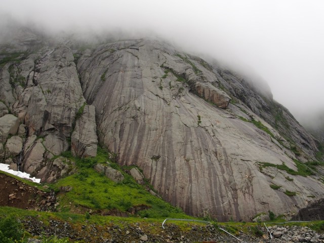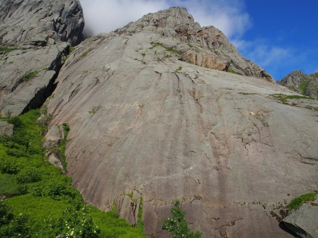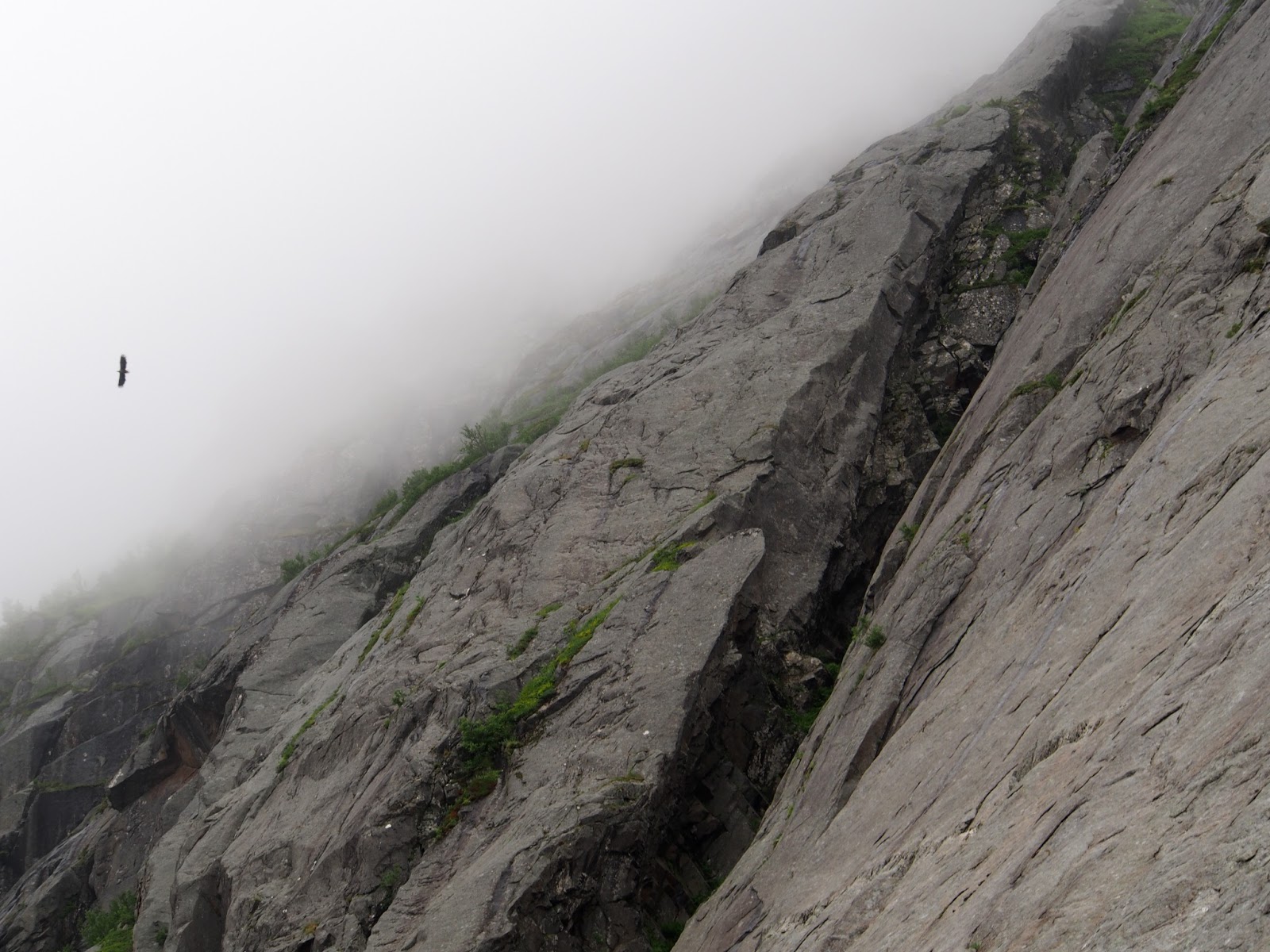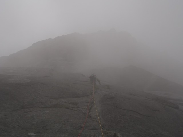 Seitsemäs kp oli taas minun, eikä näyttänyt niin kovin houkuttelevalta. Sade sentään oli loppunut, mutta mistään kitkasta ei ainakaan tossujen alla tuntunut olevan tietoakaan. Varmistuspaikkojen kanssakin oli vähän niin ja näin, mutta koska greidi nyt ei todella ollut mikään kummoinen oli oletuksena että homma näkyvissä olevan tömpyrän jälkeen helpottuu. No, eipä sitten helpottunut..tömpyrän yläpuolella oli pelkkää märkää släbiä, ilman mitään varmistuspaikkaa taikka mainittavia otteita. Yritin löytää reittiä vielä oikealta koukaten, mutta lopulta ei auttanut kuin ottaa pakit ja laskeutua ankkurille kahdesta vähemmän hyvästä kamusta. Mikko kävi vielä kokeilemassa onneaan, mutta yhtä märkää släbiä oli edessä toisellakin silmäparilla katsottuna ja päätettiin lopulta ottaa nöyrästi pakit heti ekalta kiipeilyreitiltä.