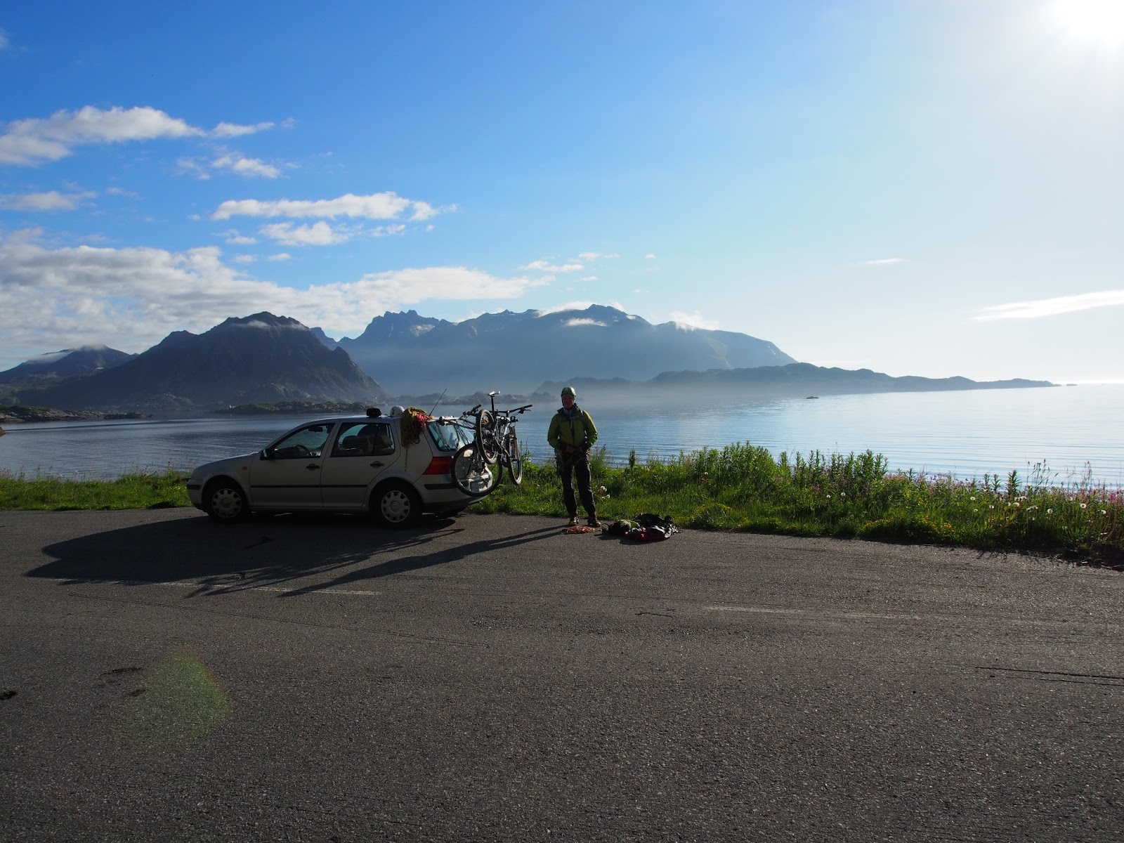 Saavuttiin Bodön lautalla Lofooteille juhannuspäivän iltana, kiipeilyfiilikset korkealla parin viikon tauon jälkeen. Tässä vaiheessa reissua oli leiriytyminen jo rutiinia, ja saatiin Wiglo nopeasti pystyyn Moskenesin leirintäalueelle.