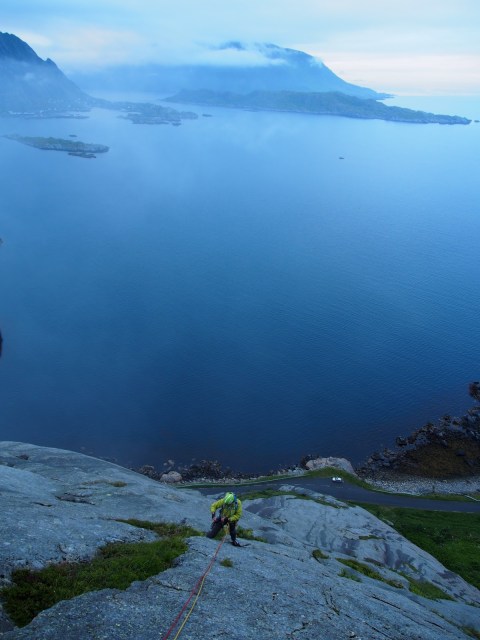 Autolle päästyä kello oli seitsemän aamulla ja oltiin oltu reitillä 15 tuntia, taisi olla sohlojen kaikkien aikojen ennätys. Reitin toppauksen sijaan oltiin eniten iloisia siitä että päästiin vihdoin turvallisesti alas, teki melkein mieli halata maata kun saavuttiin takaisin meren pinnalle. Yritettiin kovasti juhlistaa seikkailun onnellista loppua kalliilla norjalaisella oluella, muttei yllättäen sellaista ravintolasta aamuseiskalta saatu ja mentiin lopulta teltalle syömään ja nukkumaan. Lopuksi voi todeta että oppia tuli taas paljon, ensimmäisenä se ettei helpollekaan släbi-painotteiselle reitille välttämättä kannata lähteä sadeyön jälkeen. Aina vaan ei etukäteen tiedä mitä ylhäältä löytyy, släbiä kun on monenlaista sekä pienillä otteilla että niitä ilman. Hienon lisän tähän reittiin kyllä toivat seinämän yllä kaartelevat merikotkat, sekä auringon nousu vastakkaisella saarella sijaitsevien usvaisten vuorien takaa.