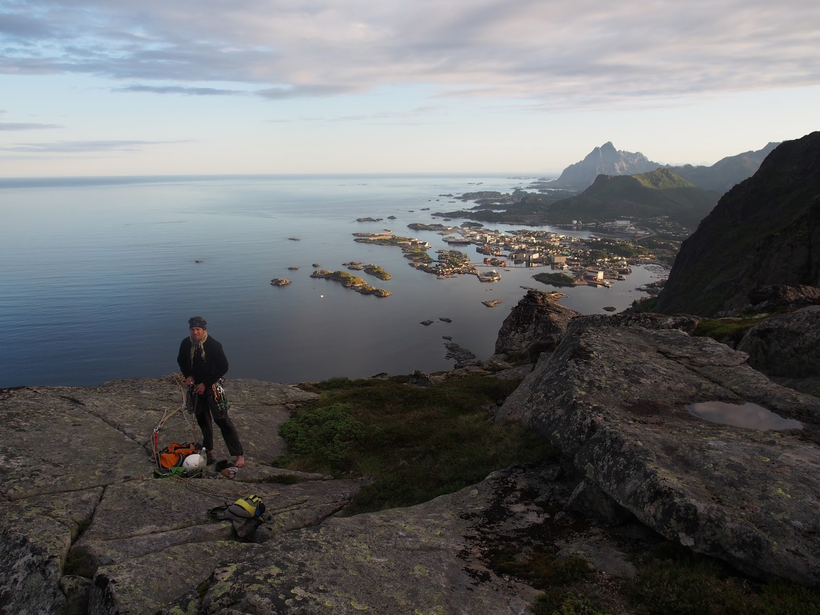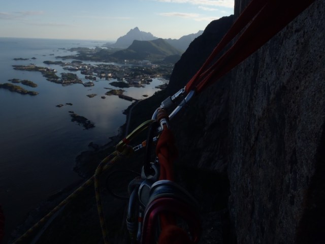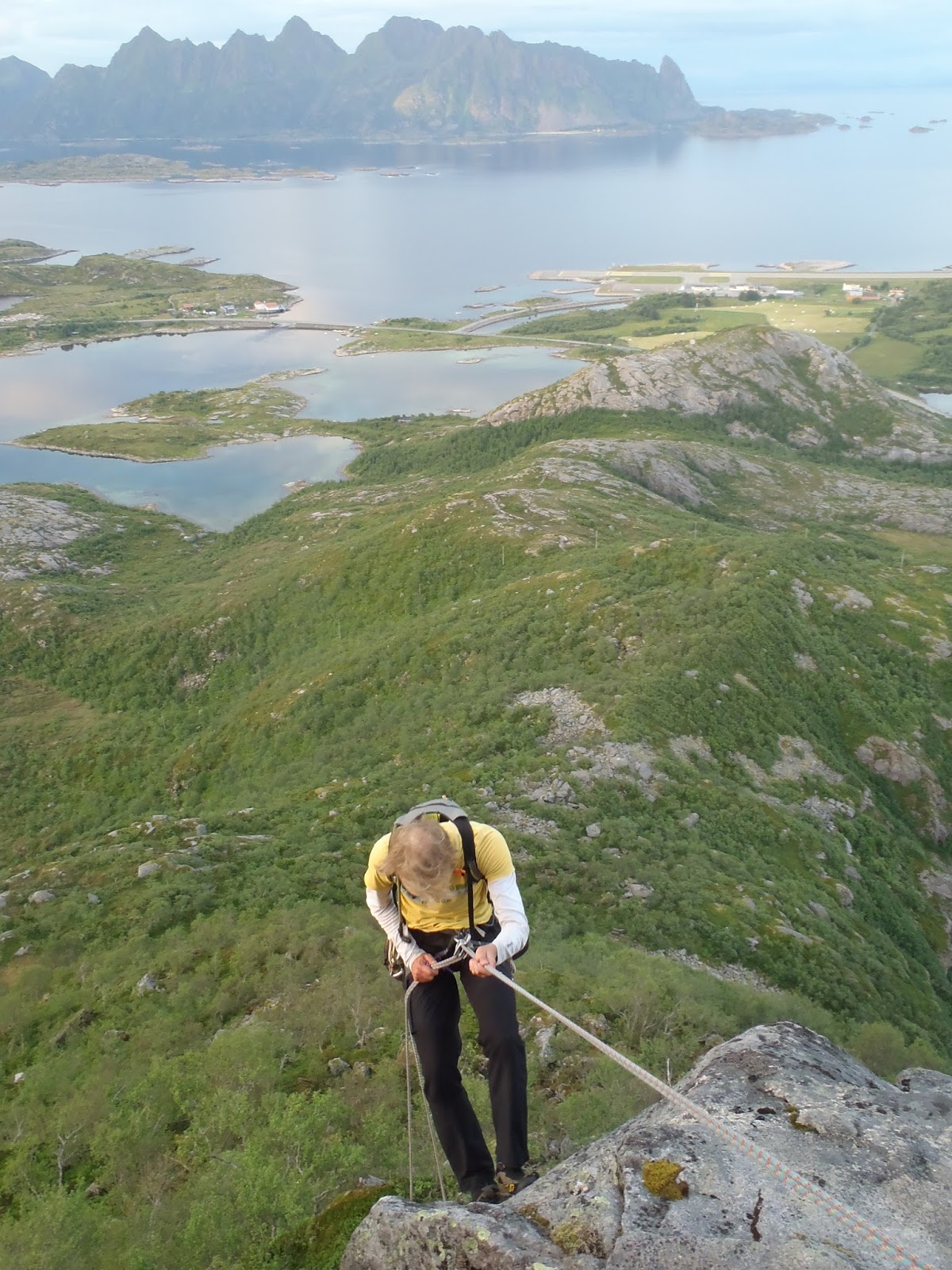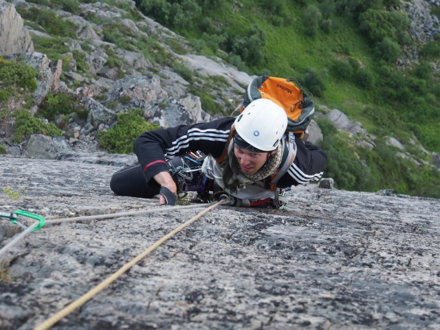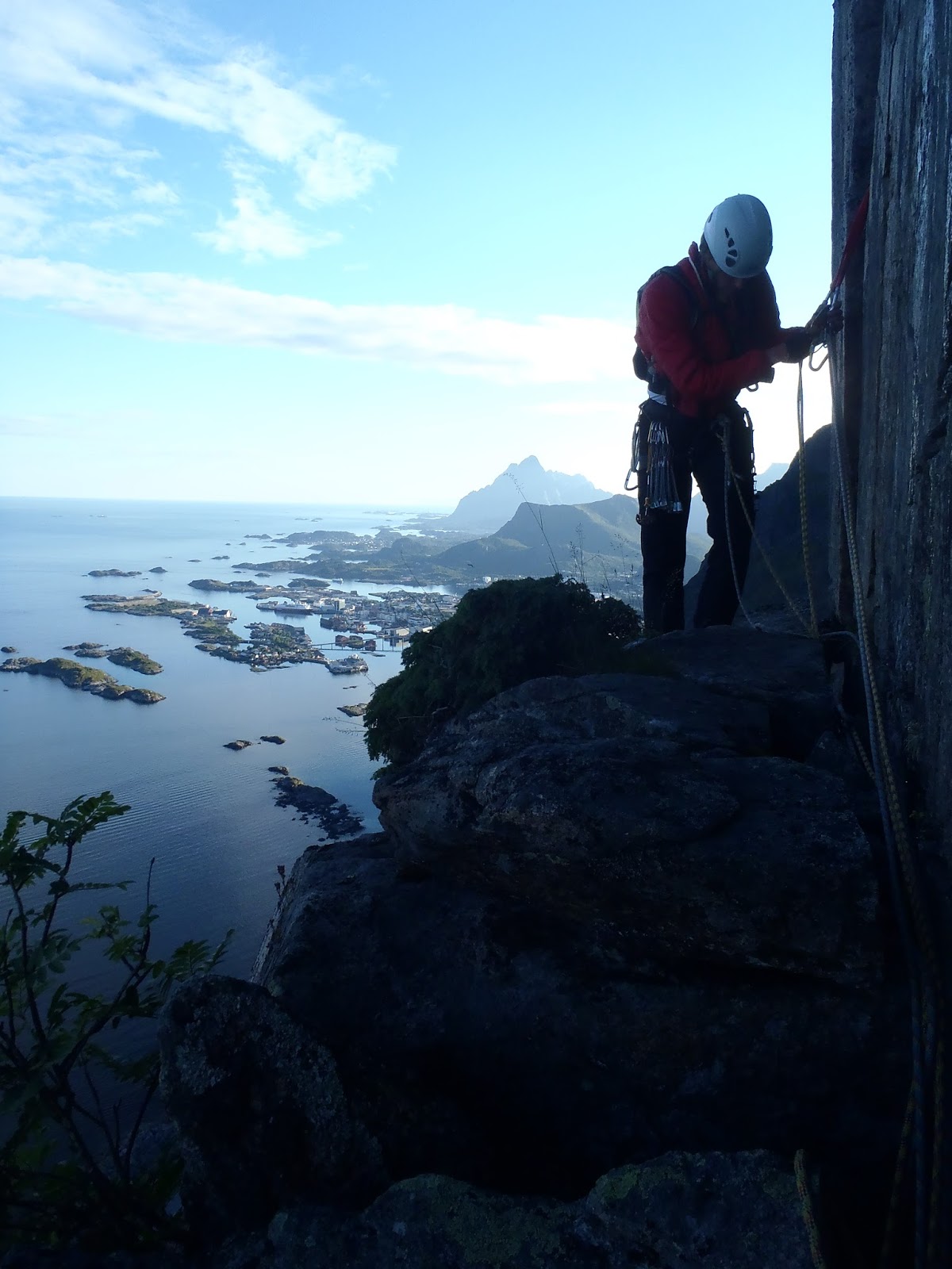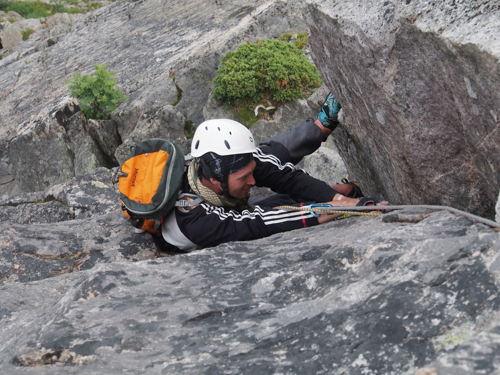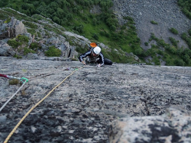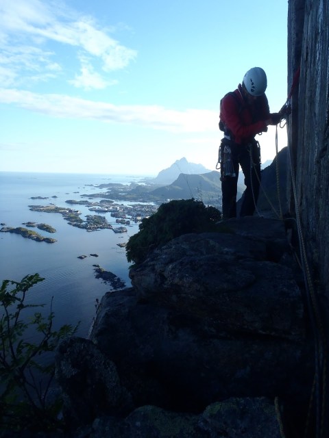 Ensimmäiset pari kp:ta, jotka lopulta menivät melkein yhdellä vedolla, olivat helppoa nelosta ja kolmosta, ei mitään hohdokasta kiipeämistä. Kun päästiin vitosia vetämään, alkoi varsinainen kiipeäminen. Reitti oli vähän epätyypillistä Lofoottien kiipeilyä, jyrkkää isoilla kahvoilla, tai ainakin epätyypillistä verrattuna siihen mitä itse on tottunut kiipeämään Lofooteilla, enemmänkin on tullut kiivettyä loivaa tai loivahkoa släbiä halkeamilla, reitistä tuli mieleen melkein Etelä-Euroopan kalkkikivikalliot. Kiipeäminen oli kuitenkin komeata ja ilmavaa, ”iso-otteista sankarikiipeilyä”, kuten Mikko asian ilmaisi. Vitosen pätkiä oli neljä, jonka jälkeen edessä komeili reitin kruksi, 6- halkeama, joka laajeni ylöspäin. Tämän pätkän olin luovuttanut jo etukäteen Mikolle. Pienen keskustelun jälkeen Mikko lähti liidaamaan. Homma sujui hienosti pienen sadattelun jälkeen, sadattelun aiheutti lähinnä se, että tarpeelliset kamut oli väärällä puolella ja jäivät kallion ja kropan väliin jumiin ja siksi piti tulla köyteen, harmillista, mutta sellaista se välillä on. Minä sitten kipaisin viimeisen helpon kp:n Rånan huipulle, joka olikin tavallista komeampi paikka! Huippu oli oikea huippu, jyrkänne joka puolella ja upeat maisemat. Myös korkealla oltiin. Merenpinnasta eli auton luota taisi tulla nousua jopa enemmän kuin Prestenillä, pitäis tarkastaa jostain kartasta, mutta hieno huippu joka tapauksessa!