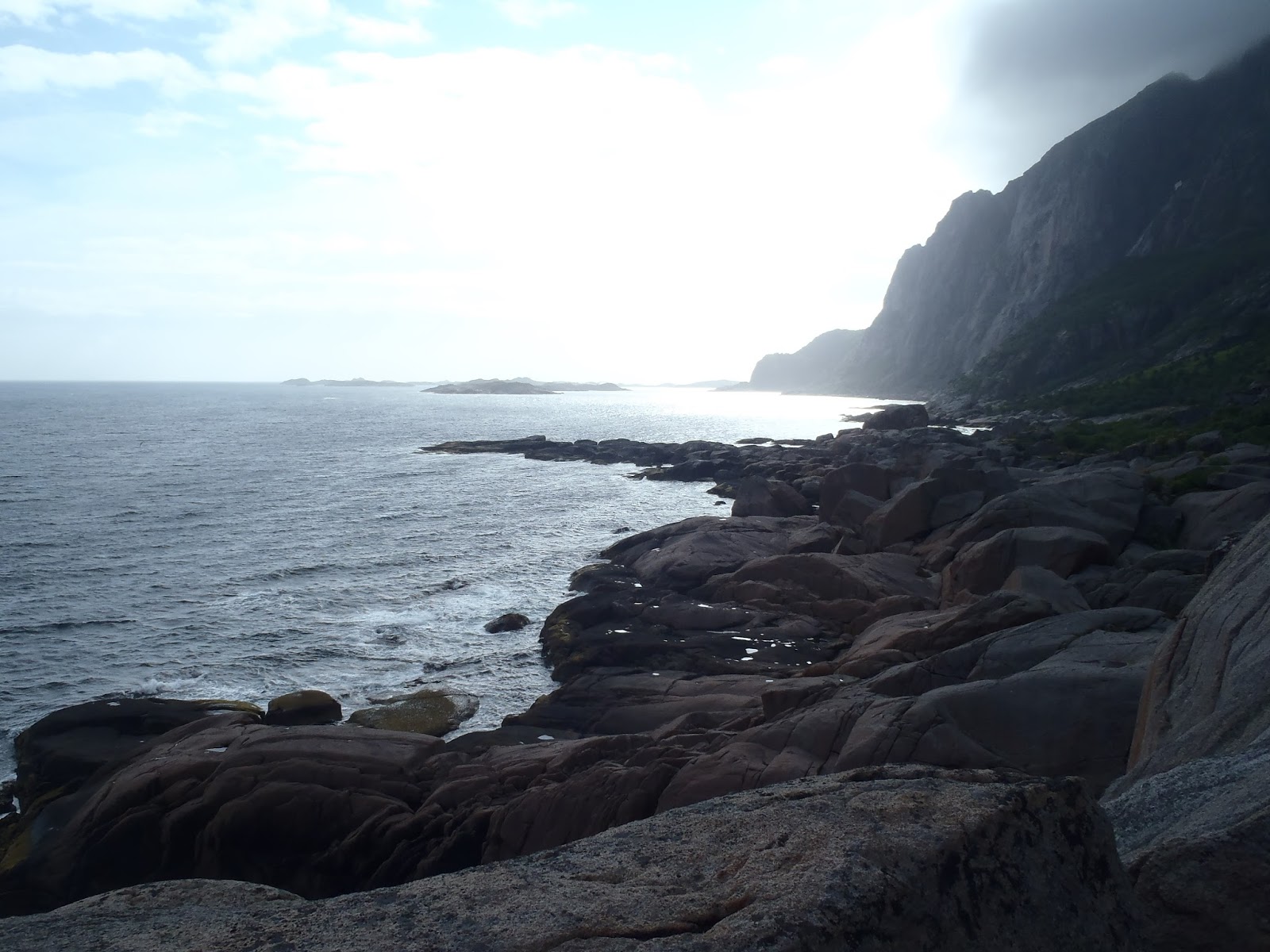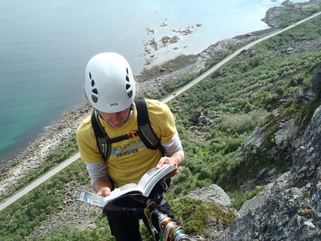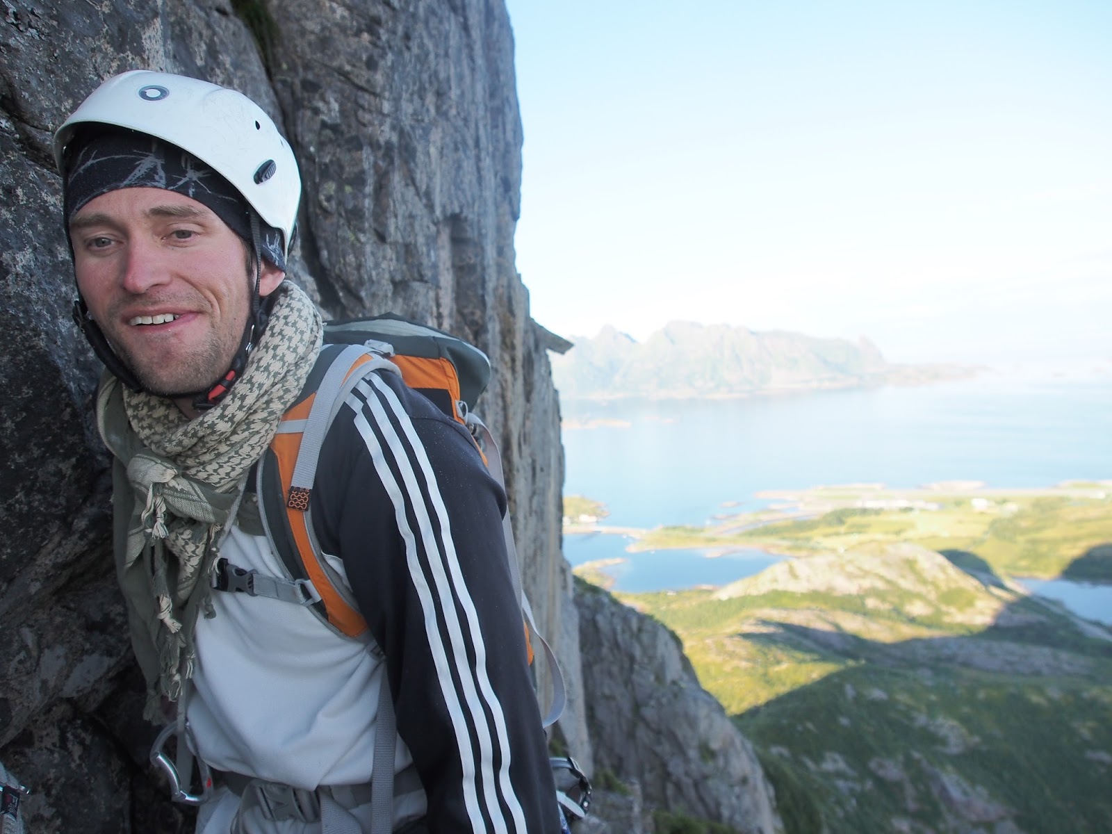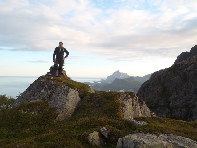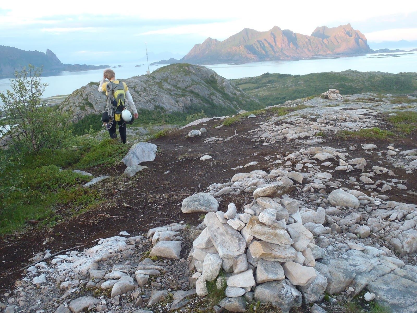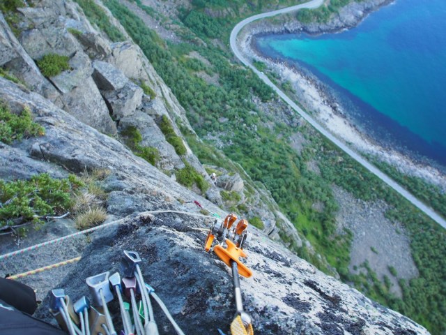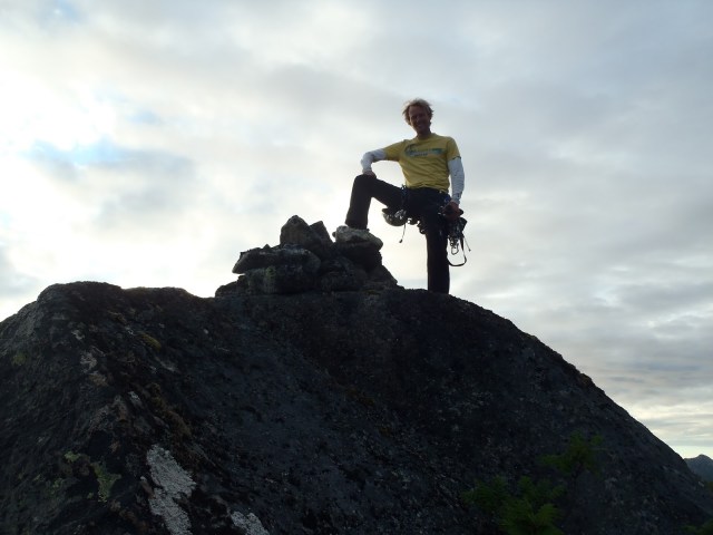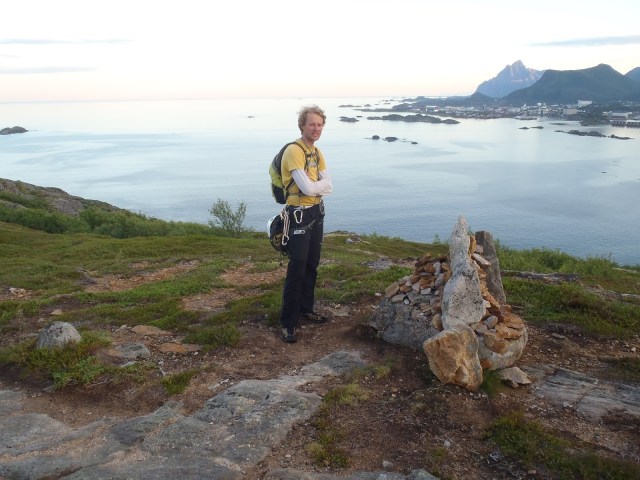 Ensimmäiset pari kp:ta, jotka lopulta menivät melkein yhdellä vedolla, olivat helppoa nelosta ja kolmosta, ei mitään hohdokasta kiipeämistä. Kun päästiin vitosia vetämään, alkoi varsinainen kiipeäminen. Reitti oli vähän epätyypillistä Lofoottien kiipeilyä, jyrkkää isoilla kahvoilla, tai ainakin epätyypillistä verrattuna siihen mitä itse on tottunut kiipeämään Lofooteilla, enemmänkin on tullut kiivettyä loivaa tai loivahkoa släbiä halkeamilla, reitistä tuli mieleen melkein Etelä-Euroopan kalkkikivikalliot. Kiipeäminen oli kuitenkin komeata ja ilmavaa, ”iso-otteista sankarikiipeilyä”, kuten Mikko asian ilmaisi. Vitosen pätkiä oli neljä, jonka jälkeen edessä komeili reitin kruksi, 6- halkeama, joka laajeni ylöspäin. Tämän pätkän olin luovuttanut jo etukäteen Mikolle. Pienen keskustelun jälkeen Mikko lähti liidaamaan. Homma sujui hienosti pienen sadattelun jälkeen, sadattelun aiheutti lähinnä se, että tarpeelliset kamut oli väärällä puolella ja jäivät kallion ja kropan väliin jumiin ja siksi piti tulla köyteen, harmillista, mutta sellaista se välillä on. Minä sitten kipaisin viimeisen helpon kp:n Rånan huipulle, joka olikin tavallista komeampi paikka! Huippu oli oikea huippu, jyrkänne joka puolella ja upeat maisemat. Myös korkealla oltiin. Merenpinnasta eli auton luota taisi tulla nousua jopa enemmän kuin Prestenillä, pitäis tarkastaa jostain kartasta, mutta hieno huippu joka tapauksessa!