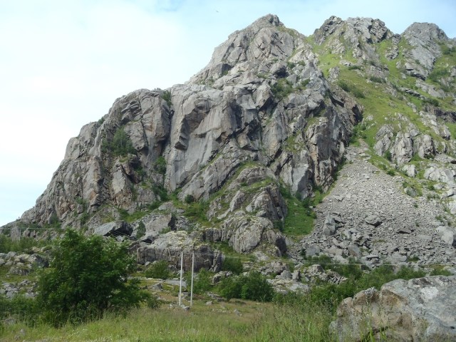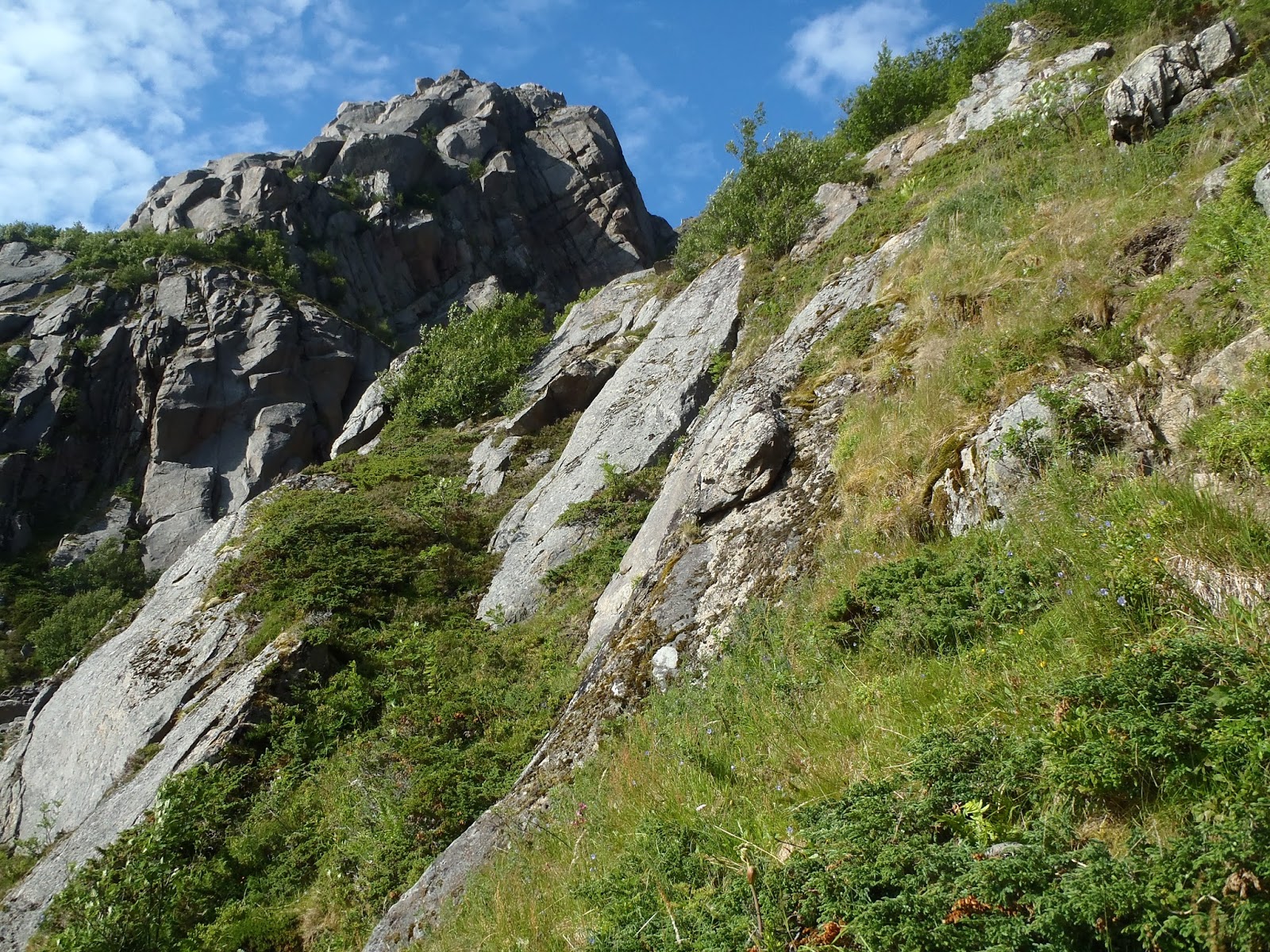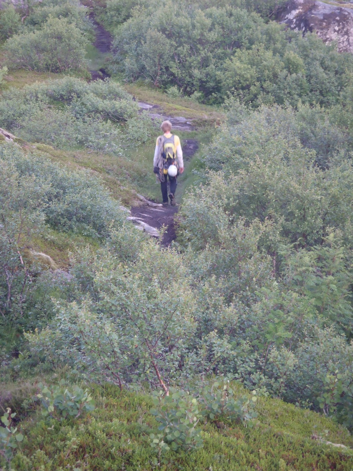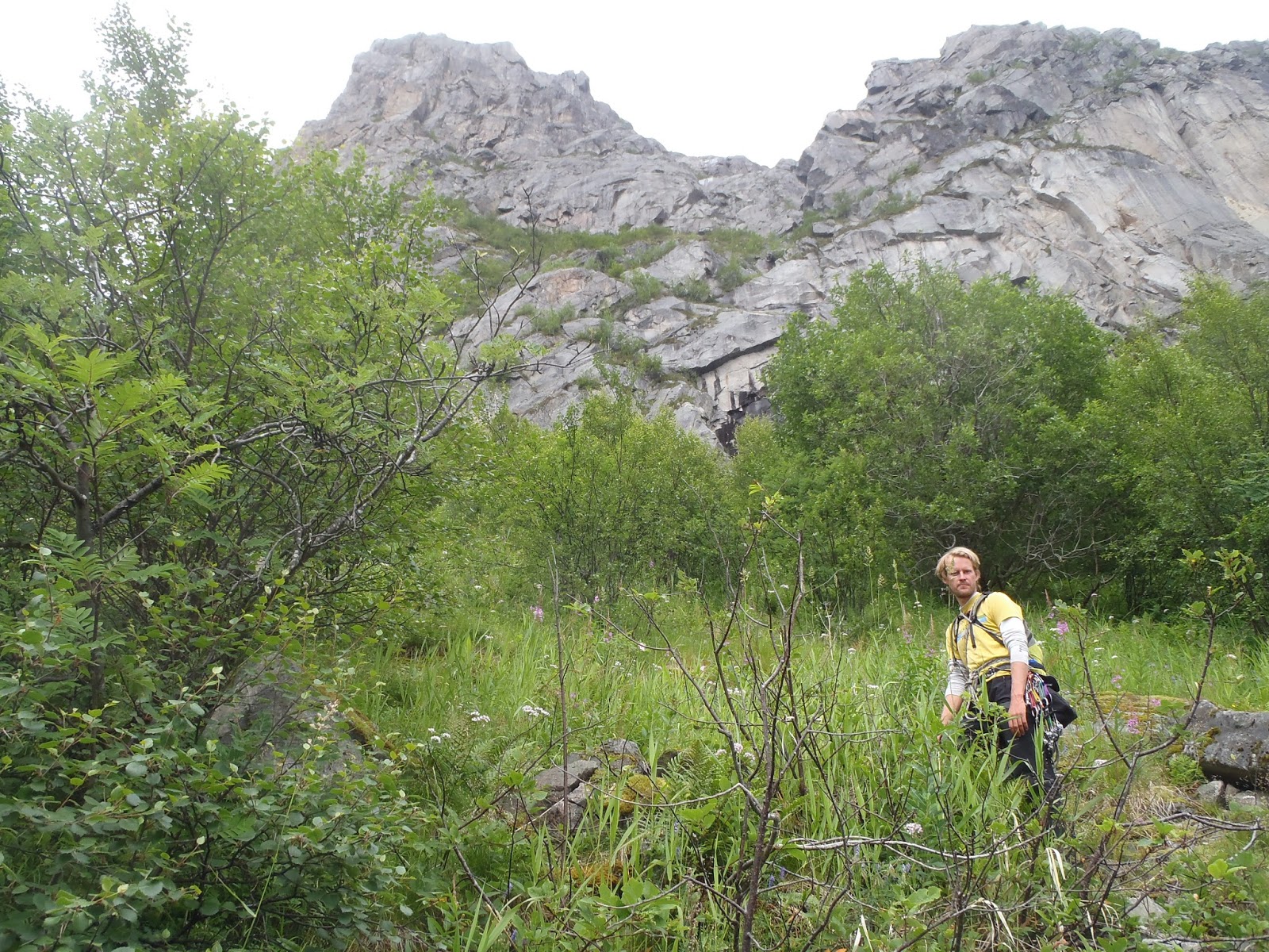Topossa puhuttiin reitin osalta, että se on ”one of Lofoten’s older classics” ja, että lähestyminen on jyrkkä ja jonkun ruohopätkän osalta vaarallinen, jos on märkää ja tietysti oli märkää, mutta että periaatteessa nousu on käveltävissä. No ehkä nämä ”old time” -kiipeilijät oli vähän kovempia kuin me, mutta ei meidän pää kestänyt sitä rinnettä kävellä ilman köysiä ja vaikka pääosin maastopohjalla mentiin, niin kyllä siinä ehkä 150 metriä noustiin ihan kiipeillen, siis köysien kanssa, ennen kuin oltiin edes reitin alussa. Taisi kolmisen tuntia kulua aikaa lähestymiseen…