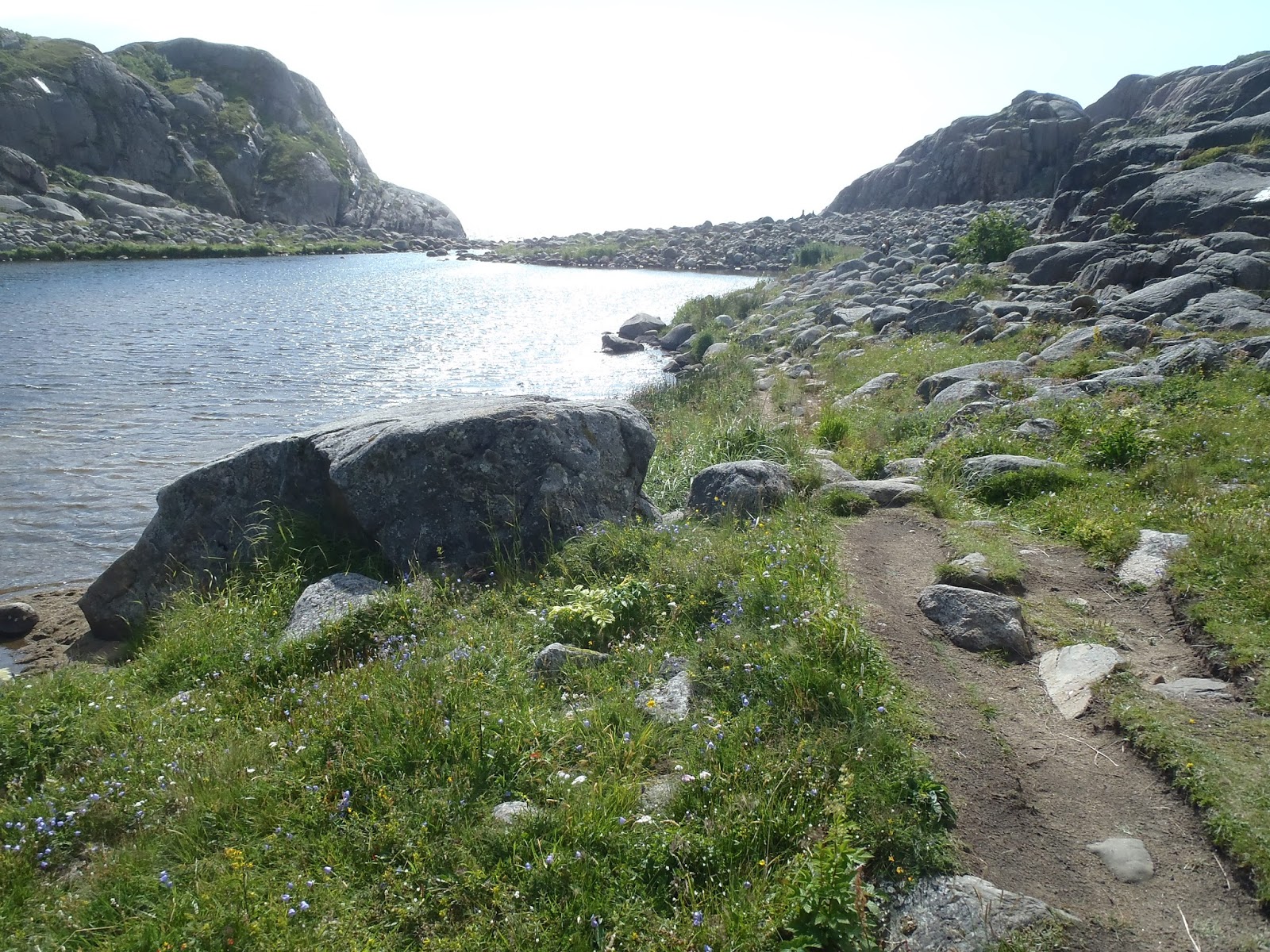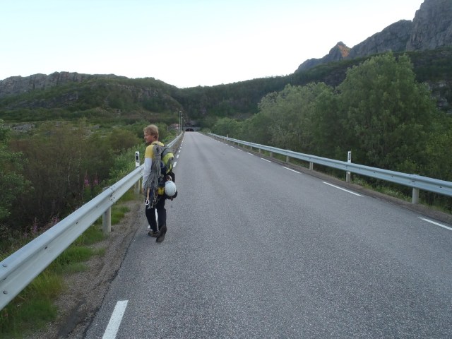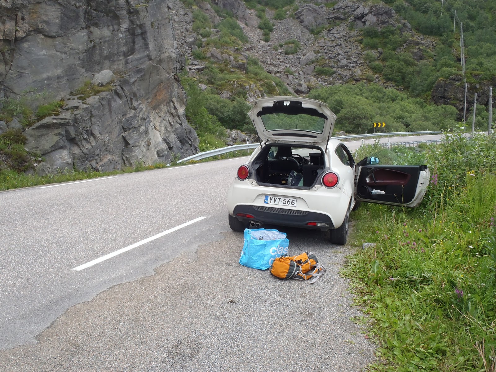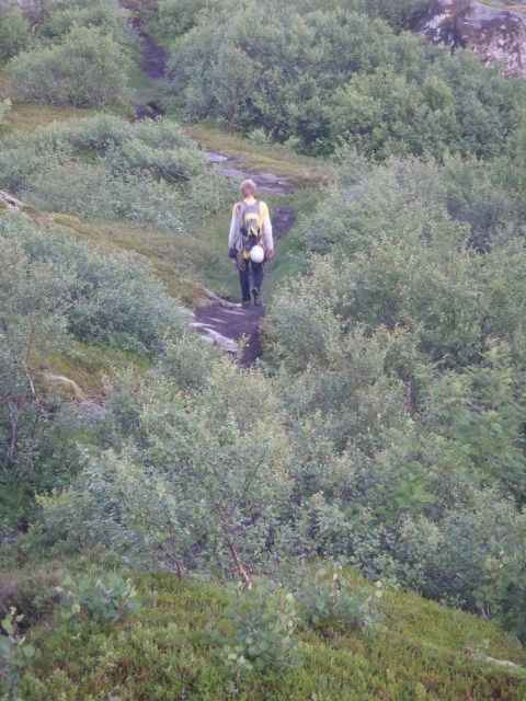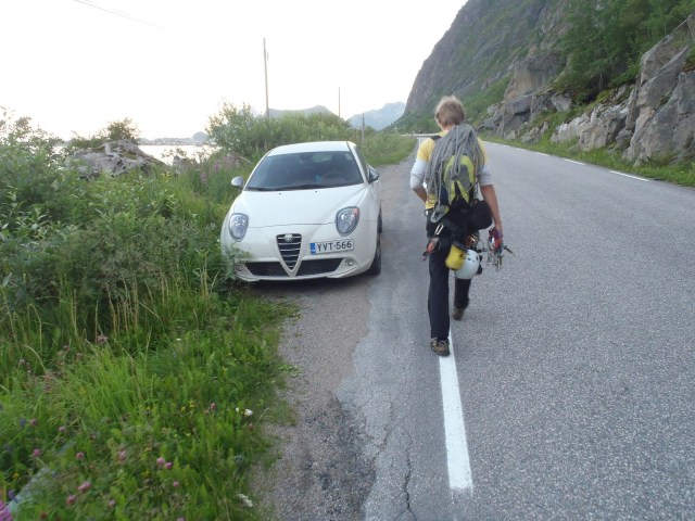 Tässä jutussa kuitenkin kuvataan minun ja Mikon Råna-kiipeily. Liikkeelle päästiin vasta iltapäivästä, koska aamupäivästä vielä satoi. Mikko käytti tilaisuuden hyväksi ja vietti aamupäivän ravintola Bacalaossa töitä tehden. Me muut sitten tultiin kelin kuivuttua noutamaan Mikko, naisosasto suuntasi kohti Bare Blåbaeriä ja me miehet kohti Rånaa. Reitti löytyi helposti, tai ainakin reitti saatiin näkökenttään helposti. Autollekin löytyi tilaa juuri siitä mistä piti. Eipä muuta kuin kamat kasaan ja nousemaan kohti kiipeilyreitin alkua.