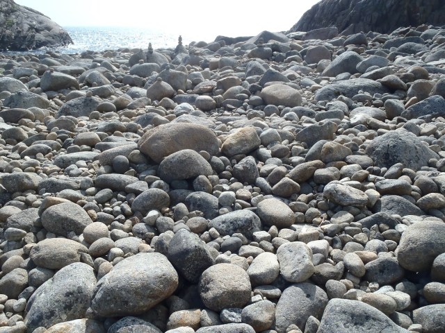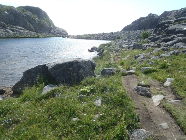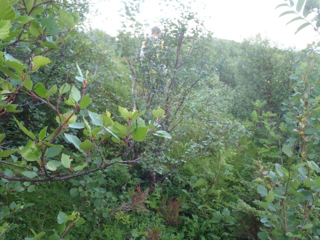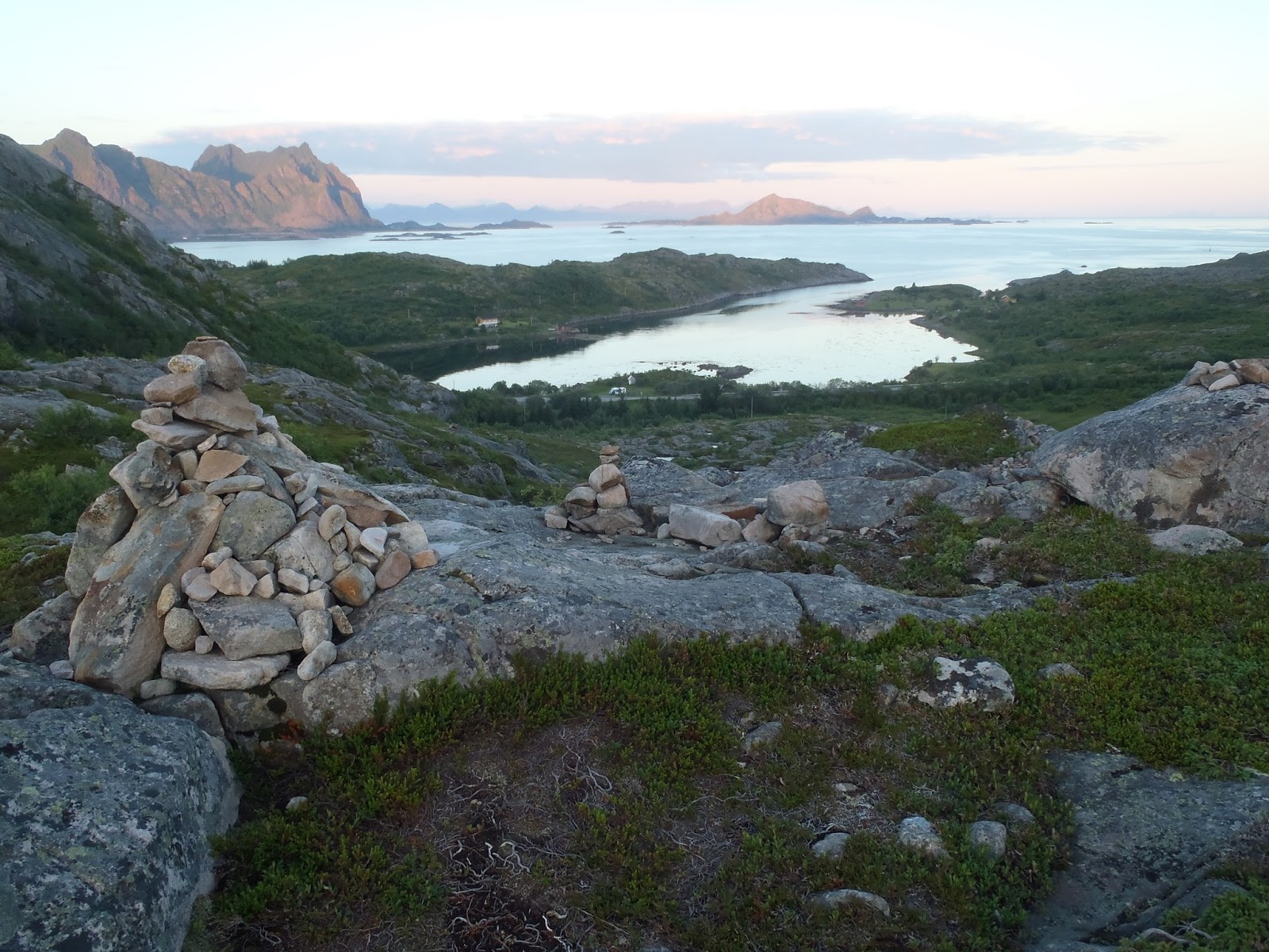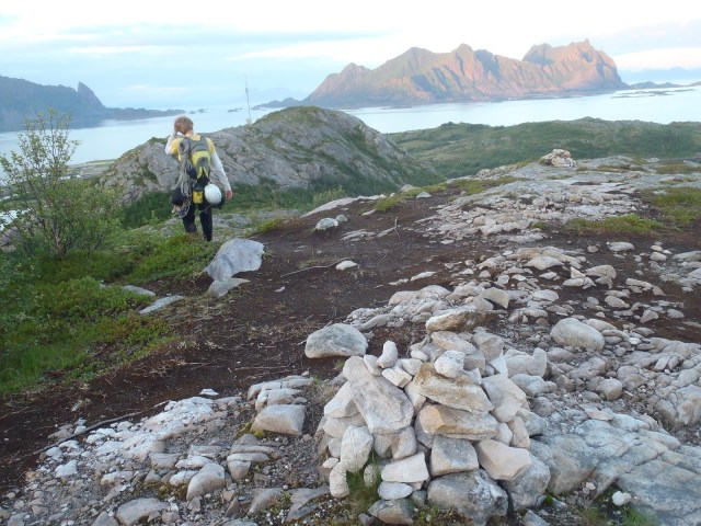 Siitä sitten evästauon jälkeen vähitellen alaspäin. Sellainen polun tyyppinen lähti jyrkästi alaspäin, minä vähän ihmettelin, mutta Mikko vakuutti reitin olevan oikea. Aikamme alaspäin hilauduttua löytyi topossa mainittu laskeutumispiste ja sen jälkeen se polun tyyppinenkin katosi ja taas tarvottiin pusikossa. Onnistuin lipsahtamaan 5Fingereilläni johonkin sammaleiseen kivenkoloon ja säärihän siinä kolahti kipeästi ja vielä naarmuuntui komeasti. Kaikki loppuu kuitenkin aikanaan, niin myös pusikko ja kivikko. Sen sijaan löytyi leveä turistipolku ja polulta löytyi sellainen hieno korkeaa kohtaa merkitsevä kivikasa. Siitä vaan eteenpäin kohti autoa…valitettavasti väärään suuntaan…ei kun takas ja toiseen suuntaan…ja valitettavasti kyseessä oli vielä ties mikä ”kymmenen huipun kierros”…ainakin muutama kivikasa löytyi ennen kuin löysimme viimein tielle vievän polun, mutta tie löytyi ja leirissä oltiin varmaan jo noin klo 01…