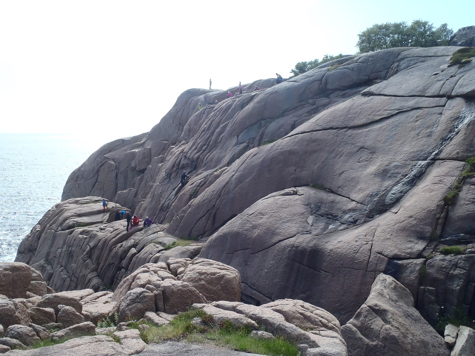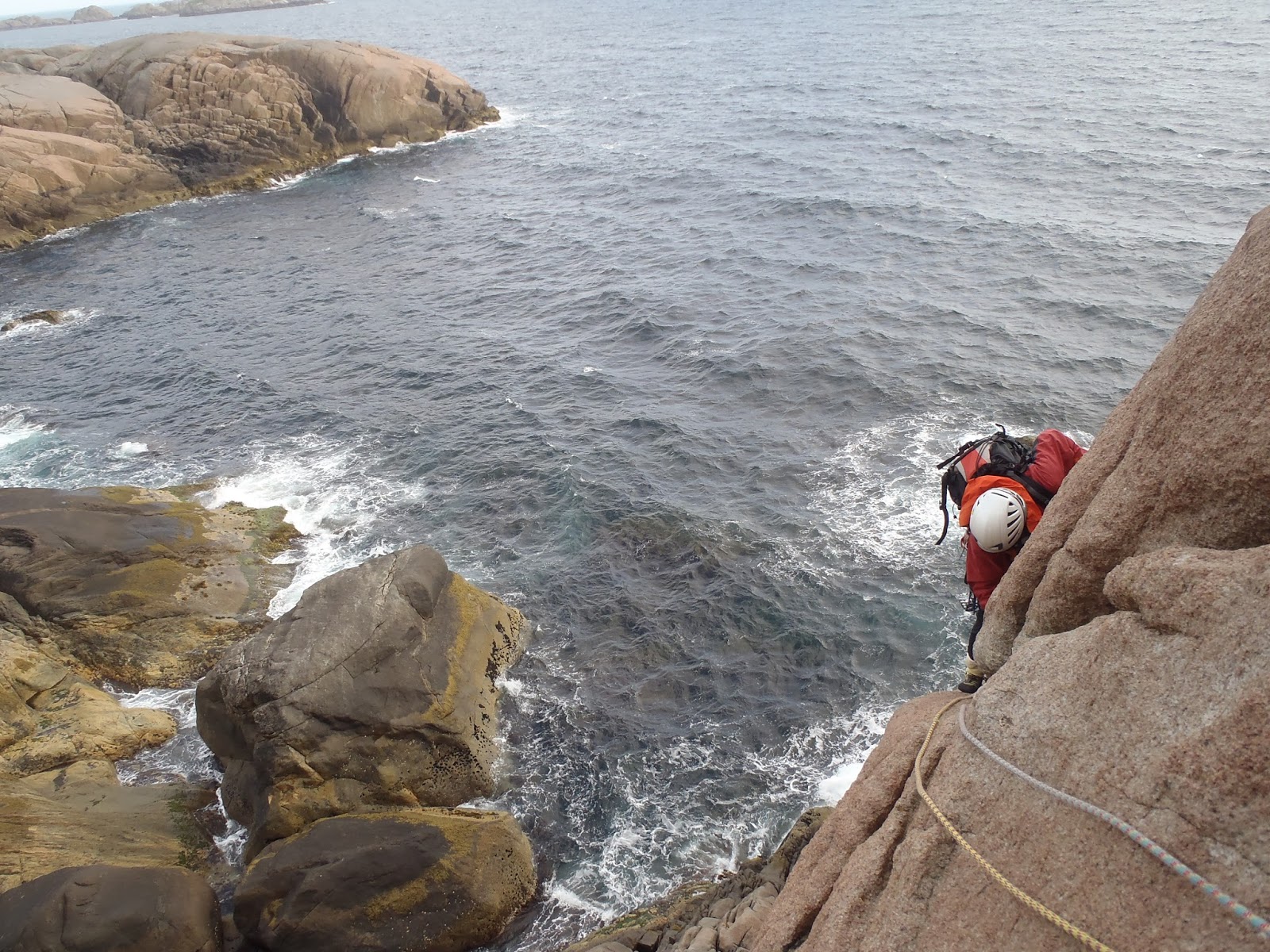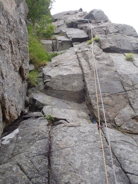 Viikon toinen puolisko aloitettiin Mikon kanssa perinteisellä ”pitkällä vedolla”. Kohteeksi valikoitui reitti nimeltään Råna (285 m, 6-), koska arvelimme virheellisesti sen olevan helposti lähestyttävissä ja poistuttavissa. Ryhmämme naispuolinen puolisko suuntasi kohti perinteistä ja legendaarista Bare Blåbaeriä (250 m, 5-, Huom! Tämä mitta on laskettu Rockfaxin topon updaten mukaisesti, jossa 7. kp:n mitta on 50 m), jonka Sohlojen köysistö tällä kertaa kiipesi ihan ylös asti kaikki seitsemän köyden pituutta, yleensä on tultu alas viidennen jälkeen, ilmeisesti ensimmäinen kerta Sohlojen historiassa. Hieno suoritus!