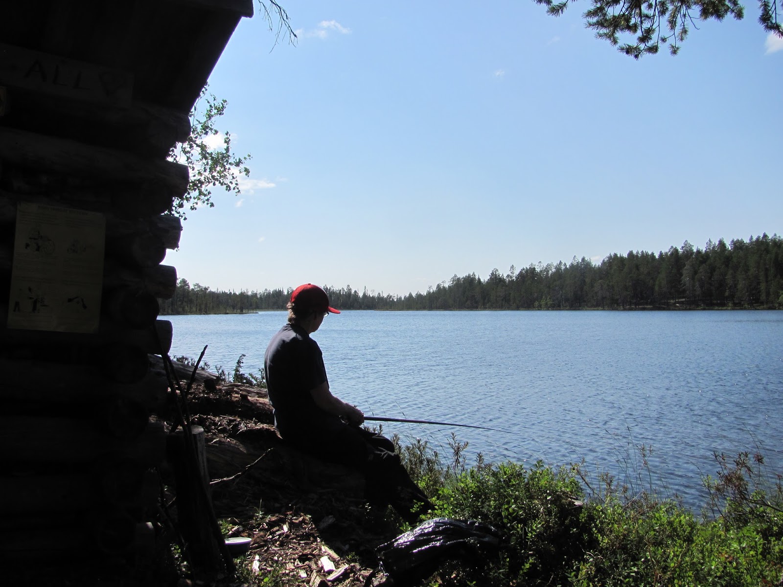 Teimme pieniä 5-7 kilometrin päiväretkiä vuokramökiltä käsin. Tosin kyllähän se skutsitetsaus kartan ja kompassin kanssa tuollaisella matkalla alkoi vähän käydä äitimuorin voimille, kun se oma reppu ja onget piti  väen väkisin itse kantaa. Me sitten siskon kanssa kannettiin innokkaina paljon evästä mukana ja pidettiin päivän mittaan lukuisia lyhyempiä ja pidempiä taukoja, jolloin päivät kuluivat lopulta erittäin leppoisasti ja äitikin jaksoi reissut erinomaisen hyvin.