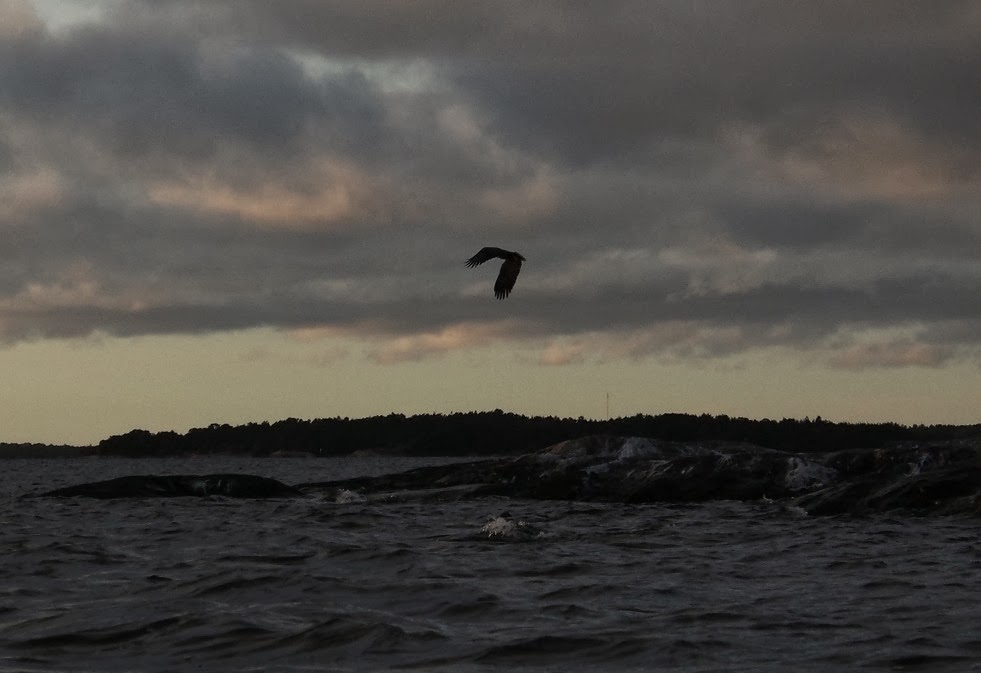 Palattiin hieman eri reittiä ja ylitettiin Iniön aukko aamuista leveämmästä kohdasta. Tuuli oli päivän aikana hieman yltynyt, ja aallokkoa oli sen verran että aukkopeitteet olivat todella tarpeen. Päästiin kuitenkin etenemään lähes myötäaallokossa, mutta avomeritunnelmaa oli enemmän kuin aamupäivän tyynellä aukon ylityksellä. Tällä etapilla tehtiin myös reissun hienoin erikoislintu-bongaus, kun merikotka nousi lentoon aivan edessämme olleelta luodolta. Kamerakin oli kerrankin iskuvalmiina ajoissa ennen kuin lintu katosi pisteeksi taivaalle. Kuvaussession jälkeen pääsimme pian Santasaaren suojaan ja mökkirantaan juuri sopivasti ennen pimeän tuloa. Loppuilta sujui taas leppoisasti saunan, punaviinin ja hyvän ruoan parissa.