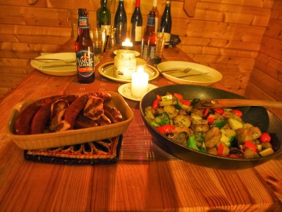 Kiipeilyjen päälle käytiin vielä nopealla melontaretkellä testaamassa kalustoa, jonka isäntäväki meille ystävällisesti aamulla toimitti. Oli taas harvinaisen hieno ilta, lähes peilityyni meri ja kirkas taivas. Isommissa saarissa oli hienosti ruskan värejä, samoin kaislikoissa. Molempien sävyt heijastuivat hienosti tyynestä vedenpinnasta, ja kuukin nousi taivaalle samalla kun rantauduttiin. Pimeä tulee nopeasti heti kun aurinko on laskenut, ja sen jälkeen on luksusta vetäytyä ulkoiluaktiviteeteista mökin lämpöön punaviinin ja takkatulen pariin. Mikko oli illallisvastuussa ja itse harrastamani reseptikikkailun sijaan saatiin vaihteeksi hieman suoraviivaisempaa mutta sitäkin maistuvamaa ruokaa, lammasmakkaroita halloum-kasvis-perunapannun kanssa. Nälkä ei jäänyt tästäkään ateriasta.