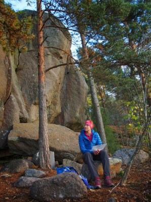 Univelkoja taisi olla jonkin verran, ihan auringon kanssa kilpaa ei todellakaan päästy seuraavana aamuna ylös. Onneksi kiipeilykallioille ei kauaa kestänyt ajella, ja päästiin pelipaikoille juuri optimiaikaan kun aurinko oli ehtinyt kuivaamaan yökosteuden pois. Alku oli pientä ihmettelyä, ei ole viime aikoina tullut juuri ulkokiipeilyä harrastettua ja Kustavi ei muutenkaan edusta sen lajin helpointa antia. Killin ja Nallin Kostolla kuitenkin päästiin taas alkuun, ja jatkettiin harjoituksia osuvasti nimetyillä reiteillä Eukkoa Ikävä ja Eukkoa Tosi Ikävä. Lisäväriä kiipeilyyn toi mainioiden reitin nimien lisäksi myös Jammi.netistä tulostettu reittien kuvaus, joka kiipeilyllisten vinkkien ohessa sisältää myös todellisia lyriikan helmiä.