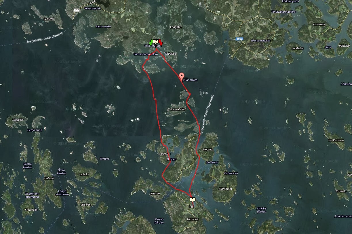 Maanantai-aamuna vedettiin toimistovaatteiden sijaan kuoret ja hameet (= aukkopeitteet) päälle ja lähdettiin melomaan kohti Iniön saarta. Tuuli oli edelleen heikkoa, ja Iniön aukon ylitys sujui vaivatta. Avomeritunnelmaa oli aallokon puutteesta huolimatta, merimetsojakin näkyi luodoilla olevan mutta lähtivät mokomat karkuun ennen kuin pääsimme kuvausetäisyydelle. Päästiin pian taas saarten suojaan ja matka jatkui Hummelholmin ja Jumon ohi Keistiön saarelle jossa Iniön kylä sijaitsee. Rantauduttiin parin tunnin melonnan jälkeen verryttelemään kajakissa puutuneita jalkoja ja evästelemään uuden karheassa venerannassa. Käytiin myös nopealla turistikierroksella kirkolla ja Iniön Lanthandelissa (sedan 1921!) ostamassa purkki kermaa haukipihvien höysteeksi. Paluumatkalle lähdettiin hieman kiireellä ettei pimeä yllättäisi ennen avomeriosuutta, mutta lossiväylää ylittäessä saatiin olosuhteiden pakosta heti reipas alkuspurtti jonka jälkeen ehti taas hyvin höllätä vauhtia ja katsella maisemia.