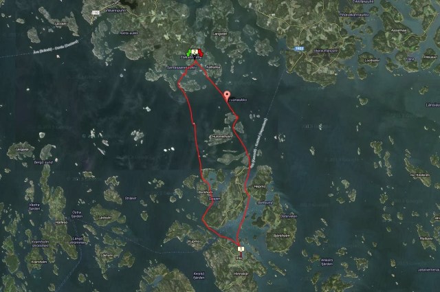| Päivän melontareitti kokonaisuudessaan, noin 25km reilua viiden kilsan tuntivauhtia |