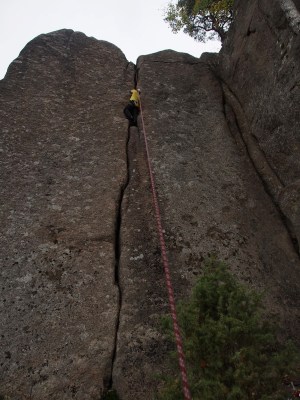 Viimeiselle lomapäivälle oli suunniteltu hieman ensimmäistä tiukempaa kiipeilyä, ja sitähän Hopeavuorella on tarjolla enemmän kuin oma kantti kestää. Aamutoimien ja mökin siivouksen jälkeen suunnattiin siis tähän jammailun mekkaan, parkkikselta avautuva näkymä kallioille tosin vei turhat luulot pois heti ensivilkaisulla. Lähempää katsottuna kalliot kuitenkin avautuivat hieman positiivisemmassa (kirjaimellisesti) valossa, ja Mikko lähti lämmittelemään Lastenhuoneen Avaimet nimisellä halkeamalla. Lämmin siinä tulikin, jopa itselleni vaikka ensin hieman huoletti pystyykö kohmeisilla sormilla kiipeämään ollenkaan. Aurinko ei ensimmäistä kertaa koko loman aikana tullut esiin koko päivänä, pilvettömään poutasäähän oli melkein jo ehtiniyt Kustavissa tottua. Seuraavana oli vuorossa klassikkoreitti Ensimmäinen Pioneeri, tiukkaa jammaamista sekin. Lopuksi pidettiin vielä kunnon jammikoulu Säkkipillillä, oli erittäin hieno halkeamareitti ja hetkittäin jammailukin alkoi lähes sujua. Parin nousun jälkeen varpaat olivat sitä mieltä että päivän halkeamakiintiö on täynnä ja kellonkin puolesta oli pakko lähteä paluumatkalle. Oli aivan mahtava syysviikonloppu, parilla ylimääräiselläkin lomapäivällä saa yllättävän hyvän irtioton arjesta kun vaan ymmärtää lähteä tarpeeksi lähelle.