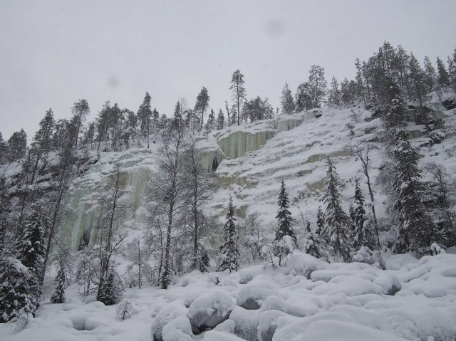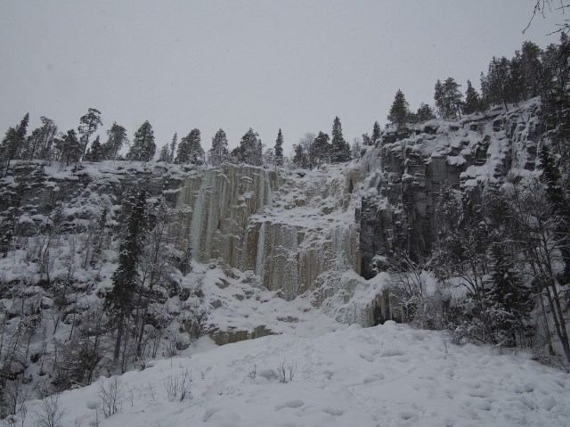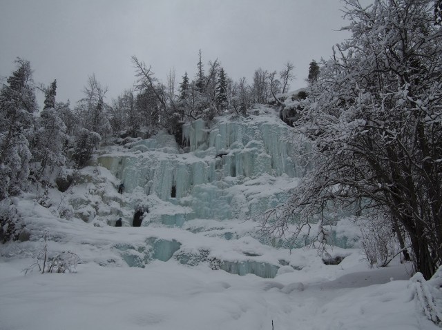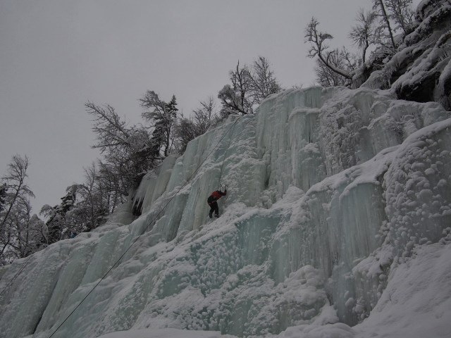 | Jaska on ilmeisesti aika isossa kunnossa. Kiivettävää oli paljon ja ehkä näistä se seikkailullisin putous. Loivaa profiilia ja sitä myöten myös lunta oli joka tuo oman elementtinsä. Hauskaa pystyä löytyi vasemmasta laidasta. |