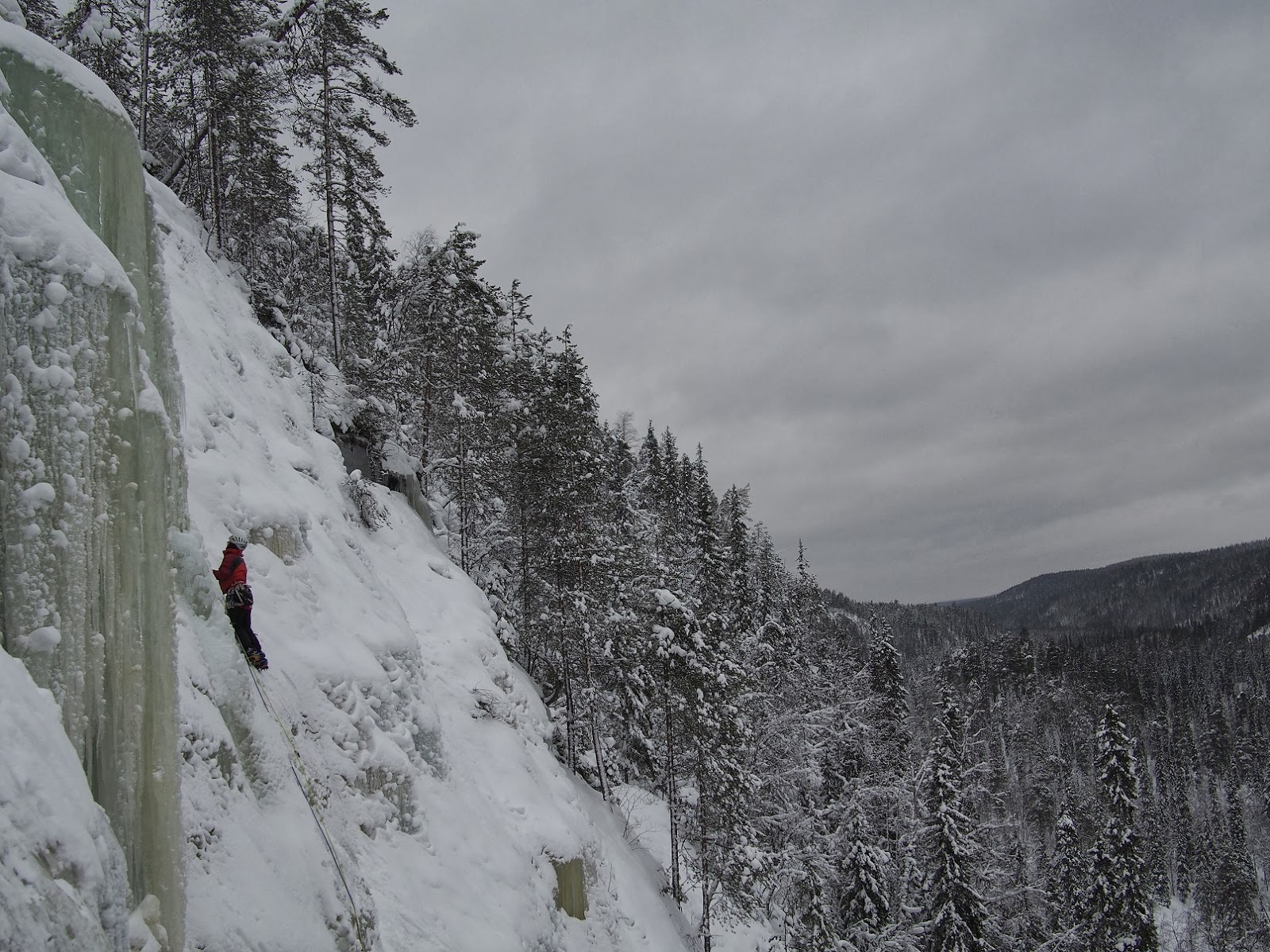 | Jaska on ilmeisesti aika isossa kunnossa. Kiivettävää oli paljon ja ehkä näistä se seikkailullisin putous. Loivaa profiilia ja sitä myöten myös lunta oli joka tuo oman elementtinsä. Hauskaa pystyä löytyi vasemmasta laidasta. |